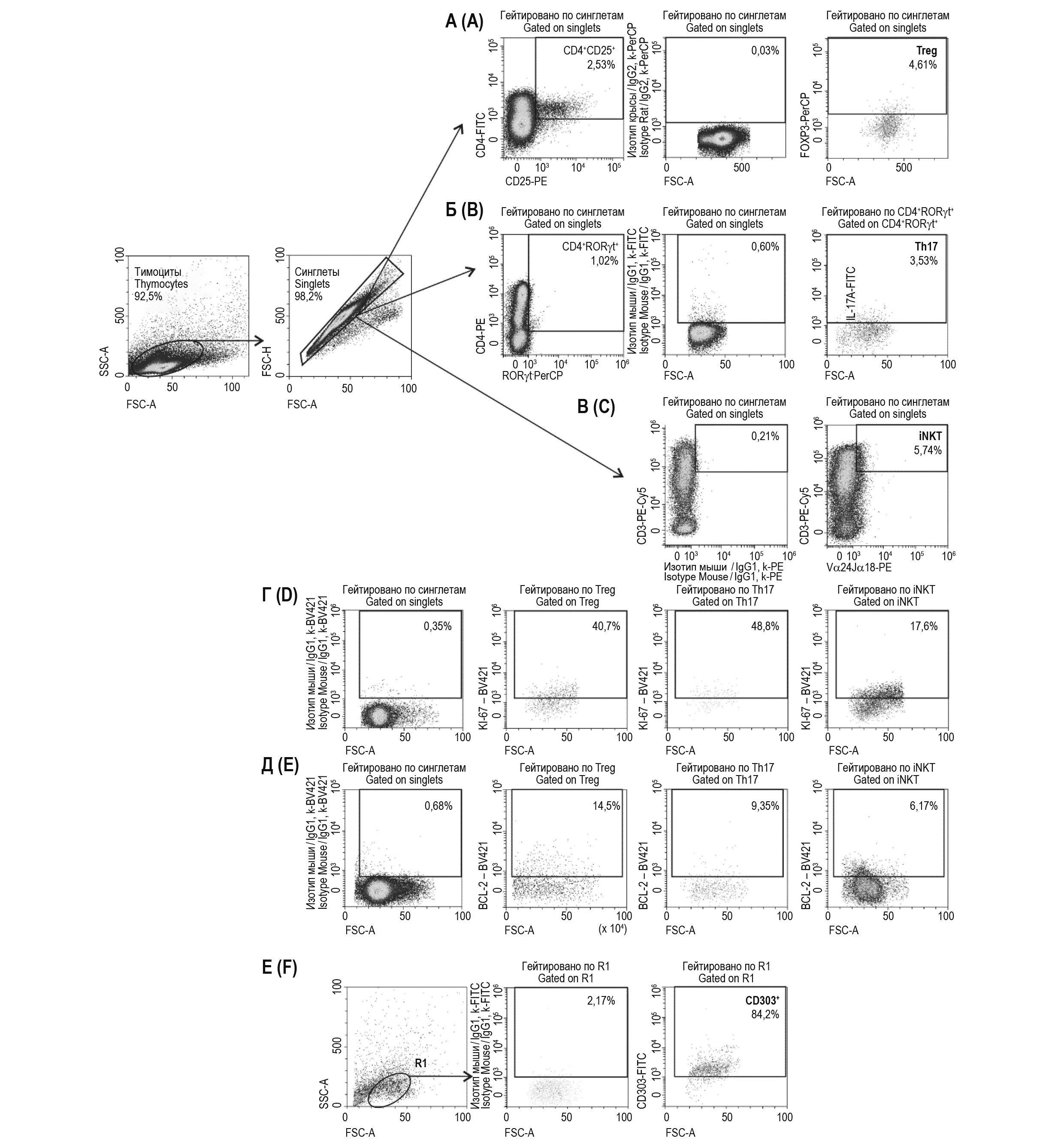 Примечание к рисунку 1. Выделение лимфоцитарного гейта в тимоцитах по параметрам прямого (FSC-A) и бокового (SSC-H) светорассеивания; дискриминация слипшихся клеток (дуплетов) по параметрам площади и высоты прямого светорассеивания (FSC-A/FSC-H). A – выделение позитивной популяций по маркерам CD4/CD25 в гейте синглетов; изотипический контроль для определения экспрессии FoxP3 в гейте синглетов; определение субпопуляции Treg как процента FoxP3+ в гейте CD4/ CD25-позитивных тимоцитов. Б – выделение CD4/RORγt-позитивной популяций в гейте синглетов; изотипический контроль для определения экспрессии IL-17A в гейте синглетов; определение субпопуляции Th17 как процента IL-17A+ в гейте CD4/ RORγt-позитивных тимоцитов. В – изотипический контроль для определения CD3hi-позитивной популяций в гейте синглетов; определение субпопуляции iNKT как процента CD3hiVa24Ja18+ позитивных тимоцитов. Г – изотипический контроль для определения Ki-67-экспрессирующих клеток в гейте синглетов; определение процента Ki-67-экспрессирующих клеток в популяциях Treg, Th17, iNKT. Д – изотипический контроль для определения Bcl-2-экспрессирующих клеток в гейте синглетов; определение процента Bcl-2-экспрессирующих клеток в популяциях Treg, Th17, iNKT. Е – определение процента CD303+ пДК в моноцитарном гейте после иммуномагнитной сепарации.