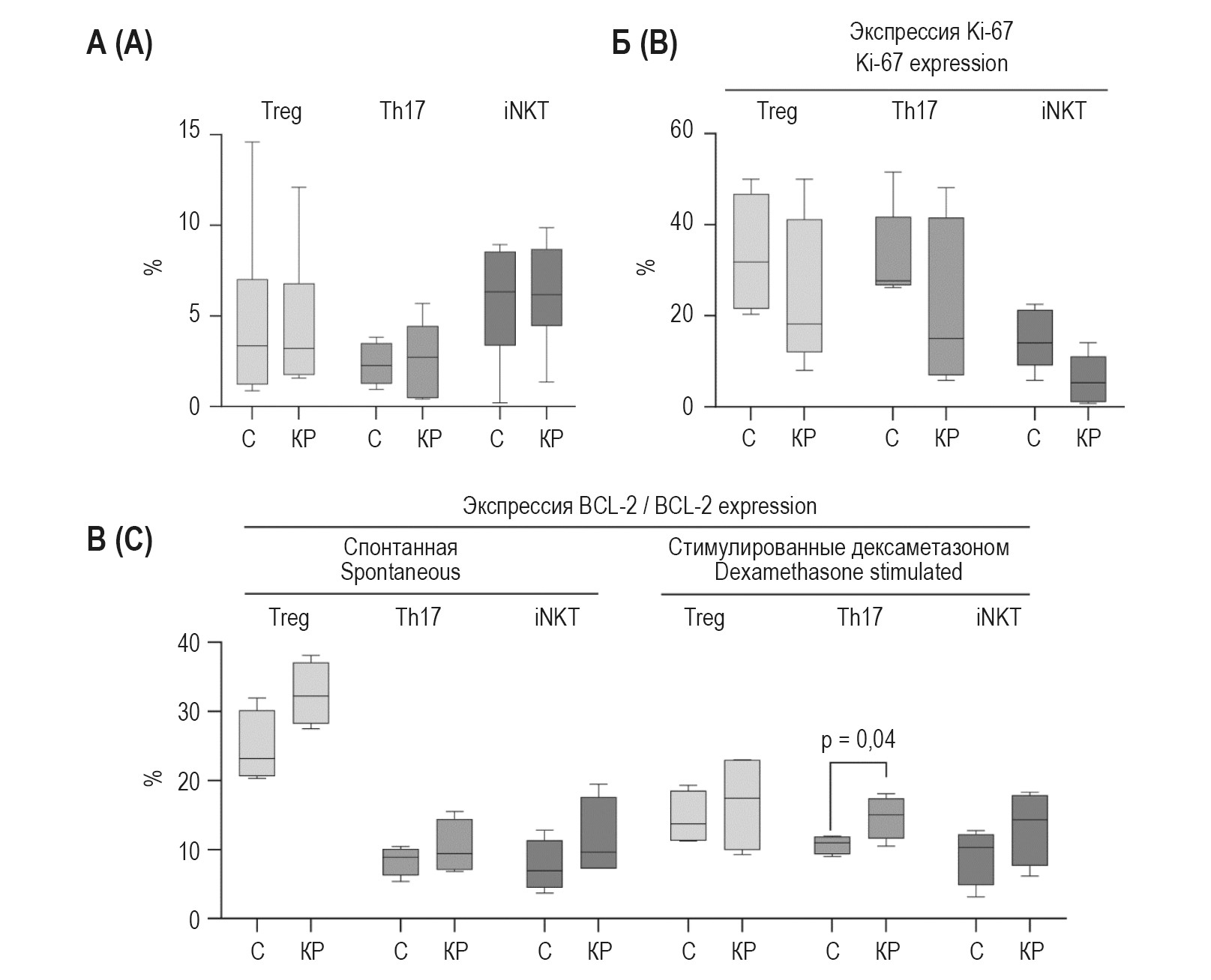 3. Figure 2. Percentage of regulatory cells (Treg, Th17, iNKT) in thymocyte cultures after 72 h cultivation in the presence of CD3/CD28 activating particles and kisspeptin (KP) or without kisspeptin (C) (A); percentage of Ki-67 expressing Treg, Th17, iNKT in these cultures (B); percentage of Bcl-2-expressing Treg, Th17, iNKT in these cultures, as well as during dexamethasone induction (C) Note. The results are presented as a median with a lower and upper quartile – Me (Q0.25-Q0.75); p is the value of the paired Wilcoxon criterion. Data from seven independent experiments are presented.
