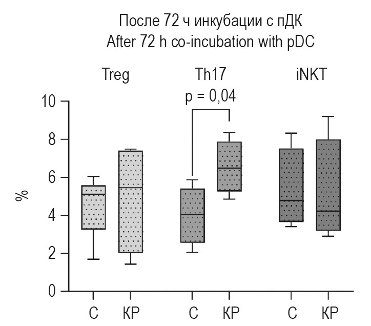 В отдельной серии экспериментов оценивали влияние примированных кисспептином плазмацитоидных (п) ДК тимуса на формирование Treg, Th17, iNKT в культуре тимоцитов при совместном инкубировании. Для этого кусочки тимуса механически измельчали и полученную суспензию концентрировали центрифугированием на фиколл-верографине с градиентом плотности 1,077 г/см3, после чего суспензию клеток фильтровали с использованием сита для клеток диаметром 30 мкм (Miltenyi Biotec, Германия) для удаления остатков [11]. Клетки из фракции низкой плотности использовали для выделения пДК (2 × 108 клеток/мл). Чистота выделения, контролируемая по экспрессии CD303 (Anti-Human CD303 (BDCA-2) FITC, clone 201A) [11], составляла более 80%. Полученные пДК ресуспендировали в 1 мл ППС и инкубировали по 0,1-1 × 106 кл/мл в присутствии кисспептина 24 ч при 37 °С и 5% СО2. После 24 ч инкубации к пДК добавляли суспензию аутологичных интактных тимоцитов (0,1-1 × 107 кл/мл в 1 мл ППС) и инкубировали клетки совместно ٧٢ ч, после чего анализировали фенотип на проточном цитометре CytoFlex S (Beckman Coulter, США). Контроль жизнеспособности клеток на этапах выделения и инкубации осуществляли с помощью окрашивания трипановым синим в каждой пробе. Жизнеспособность клеток не отличалась в пробах с кисспептином и без (контрольных) и составляла более ٩٥٪ на всех этапах исследования.