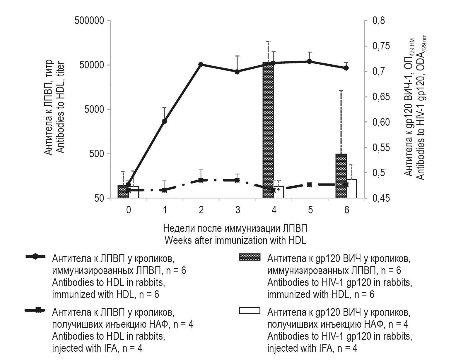 Кроликов (n = 6) иммунизировали нЛПВП человека (Kalen Biomedical, США) в дозе 200 мкг (по белку). Липопротеины вводили в заднюю часть спины однократно внутрикожно в неполном адъюванте Фрейнда (НАФ) (InvivoGen, США). Контрольная группа животных (n = 4) получила инъекцию НАФ. В крови животных определяли уровень антител к нативным ЛПВП и антител к gp120 ВИЧ-1 (ACROBiosystems, США). Антитела к gp120 ВИЧ-1 были измерены перед иммунизацией кроликов и на 28-й и 42-й дни после иммунизации ЛПВП, антитела к ЛПВП измеряли еженедельно в течение 42 дней после иммунизации. Гистологический анализ аорты проводили через 8 месяцев после иммунизации.