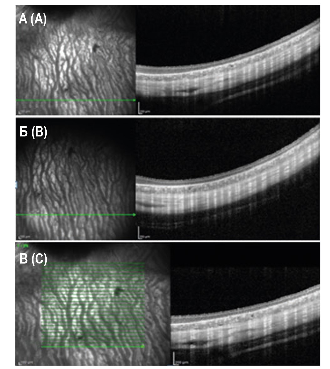 В позднем периоде наблюдения (28-60-е сутки) отмечается частичное уменьшение прохождения сканирующего луча под сетчатку, что может указывать на частичное восстановление клеток РПЭ. Осложнений и отрицательной динамики не было выявлено, слои сетчатки дифференцированы (рис. 2В).