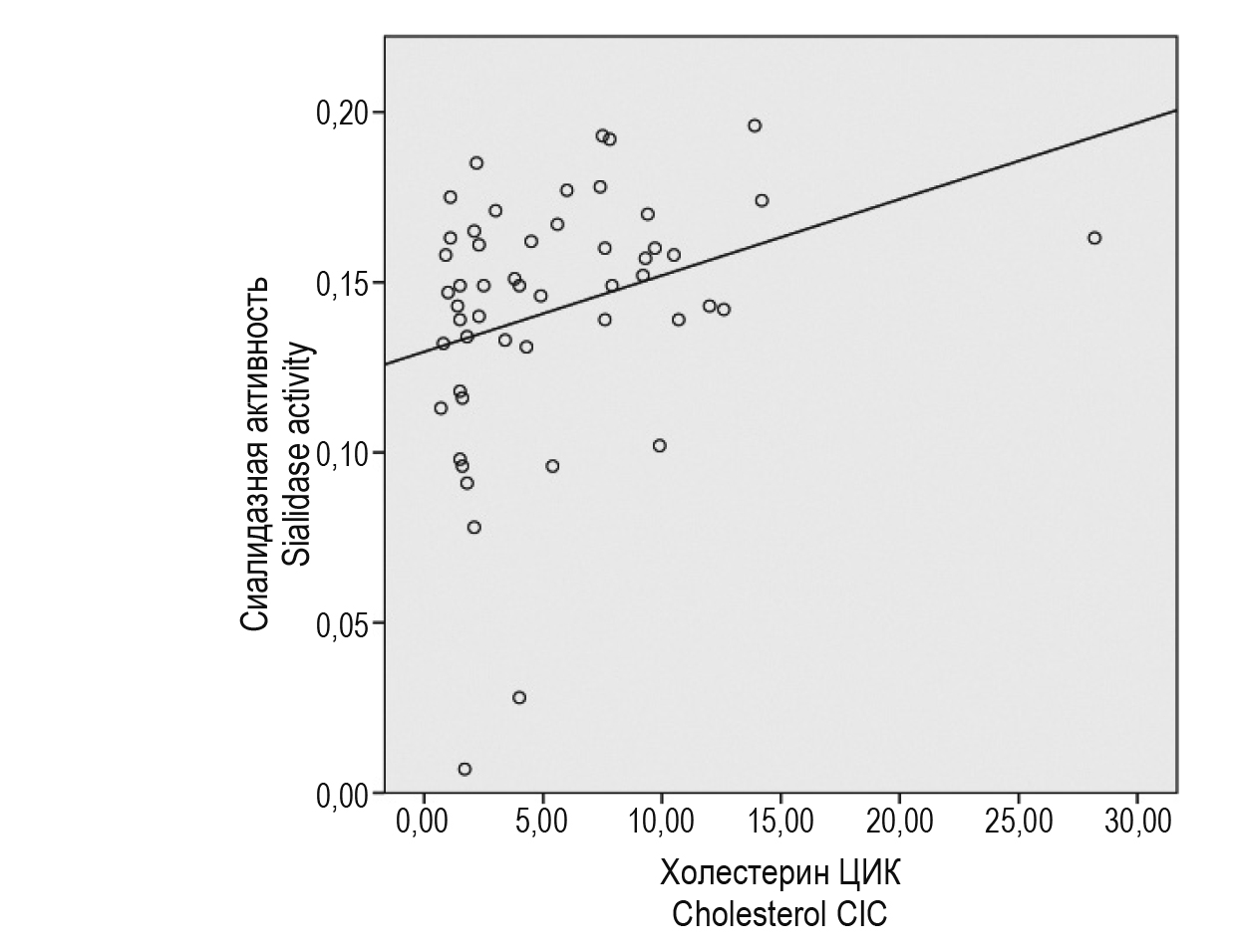В результате корреляционного анализа выявлена значимая положительная связь между содержанием холестерина циркулирующих иммунных комплексов и сиалидазной активностью в сыворотке крови (r = 0,305 при p = 0,029) (рис. 1). Поскольку десиалированные ЛНП являются аутоантигенами, то они приводят к выработке антител. Антитела приводят к образованию и накоплению холестеринсодержащих ЦИК [11].