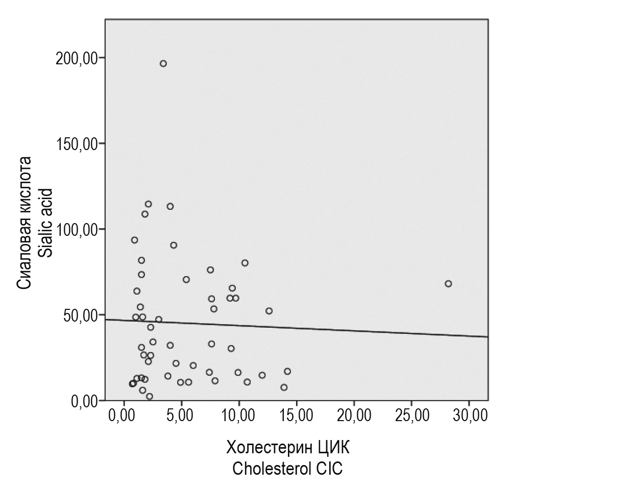 При сравнении содержания холестерина ЦИК в сыворотке крови и сиаловой кислоты в ЛНП (рис. 2) выявлена статистически не значимая связь (r = -0,041 при p = 0,775). Т. е. между данными показателями корреляции не выявлено. Таким образом, повышенное содержание холестерина в ЦИК напрямую не связано с содержанием сиаловой кислоты в ЛНП. По-видимому, образование ЦИК зависит от степени иммуногенности десиалированных ЛНП и иммунореактивности организма.