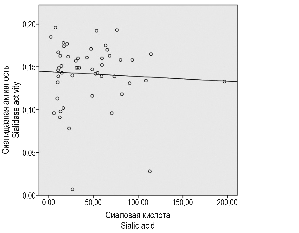 Между показателями содержания сиаловой кислоты в ЛНП и сиалидазной активности в сыворотке крови (рис. 3) корреляции не выявлено (r = -0,056 при p = 0,695). Отсюда можно предположить, что влияние сиалидаз на десиалирование ЛНП характеризуется высокой индивидуальной вариабельностью.