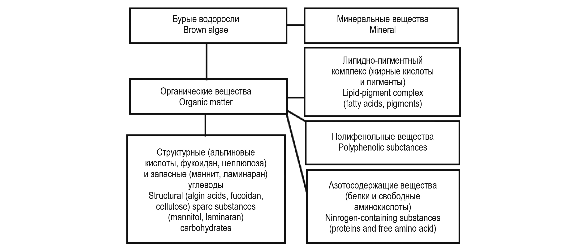 Основной химический состав бурых водорослей может быть представлен следующими группами компонентов: минеральные вещества, в том числе микроэлементы; органические вещества: липидно-пигментный комплекс (жирные кислоты, пигменты), полифенольные вещества, азотсодержащие вещества (белки и свободные аминокислоты), структурные углеводы (альгиновые кислоты, фукоидан, целлюлоза), запасные углеводы (маннит, ламинаран) [1] (рис. 1).