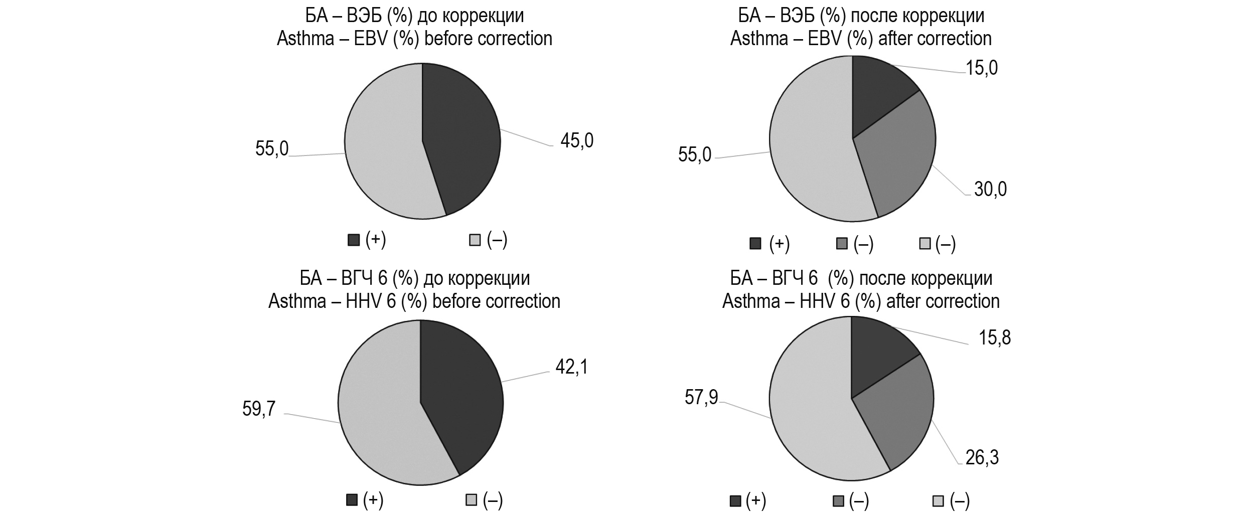 Противовирусный эффект комплексной терапии у детей с БА был обнаружен при исследовании мазков из ротоглотки на активность персистирующих герпес-инфекций (4-ВЭБ и 6 типов) до и после проводимой коррекции. Частота выделения вирусов герпетической группы у обследованных детей до введения дополнительного продукта составила ВЭБ – 45,0%, герпес 6-го типа – 42,1% (рис. 2).