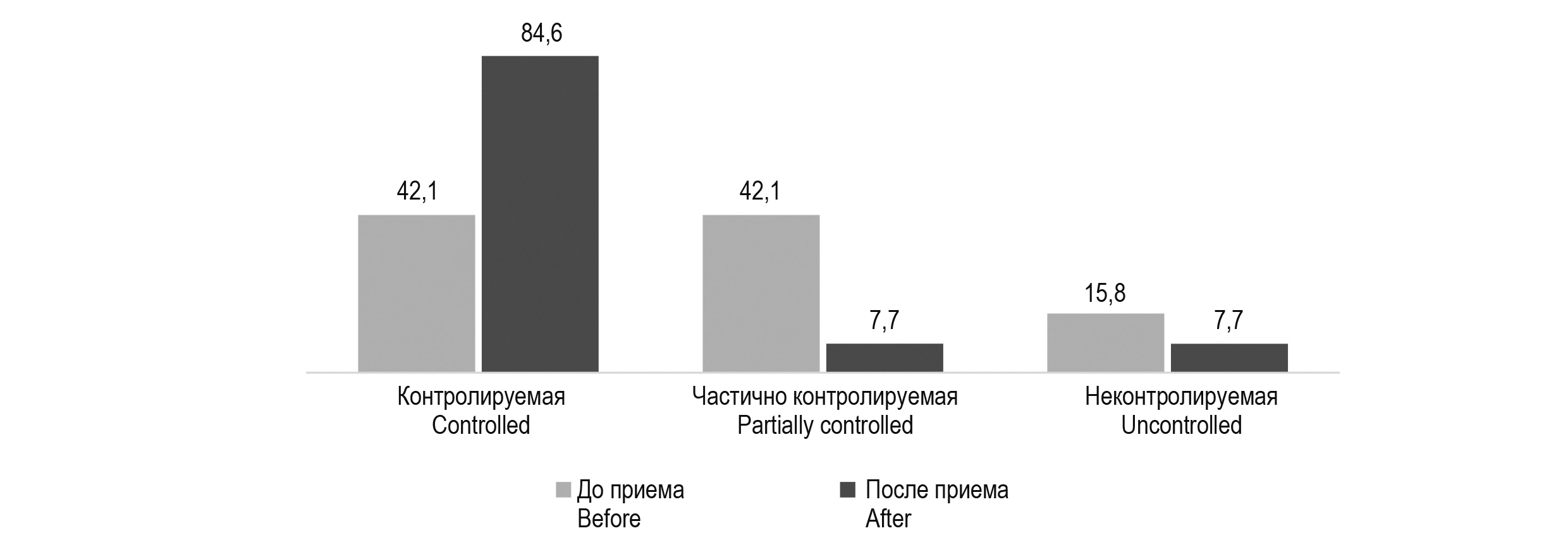 Процент пациентов с полностью контролируемой БА на фоне его использования вырос более чем в два раза, с 42,1% до 84,6% (р = 0,003), в первую очередь за счет детей, у которых заболевание ранее контролировалось частично, их доля упала почти в 6 раз, с 42,1% до 7,7% (р = 0,006). Доля детей с неконтролируемой БА имеет недостоверную тенденцию к снижению с 15,8% до 7,7% (р = 0,21). Это подтверждает функциональный характер изменений, происходящих под действием продукта «ДороМарин» в организме пациентов с БА.