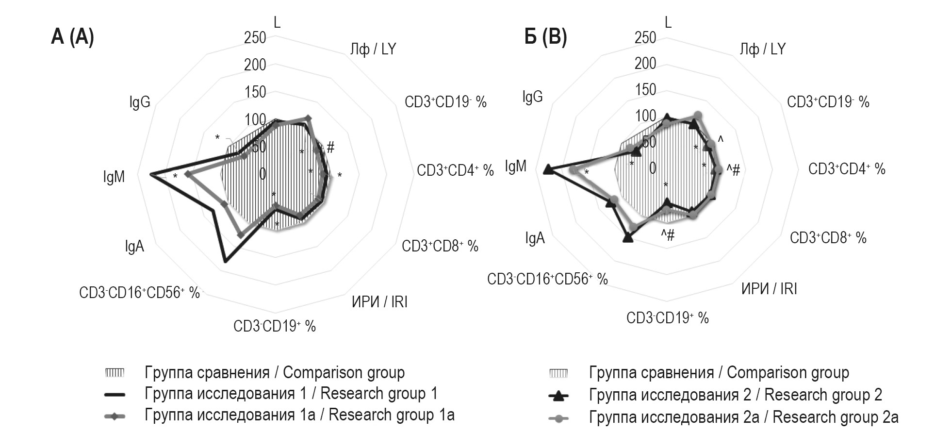 Методом проточной цитофлуориметрии (FC500, Beckman Coulter, США) с соответствующими МкАТ Beckman Coulter International S.A. (Франция) проведено иммунофенотипирование Т- и В-лимфоцитов (CD3+CD19-, CD3+CD4+, CD3+CD8+, CD3-CD19+), естественных киллерных клеток (ЕКК – CD3-CD16+CD56+) периферической крови (ПК), рассчитан иммунорегуляторный индекс (ИРИ – CD3+CD4+/CD3+CD8+). Методом ИФА определяли уровни сывороточных IgA, IgM, IgG, IFNα, IFNγ, цитокинов – IL-1β, TNFα, IL-6, IL-8, IL-18, IL-4, IL-10 (тест-системы АО «Вектор-Бест», г. Новосибирск, Россия). При проведении статистического анализа использовали непараметрические статистические критерии Вилкоксона и Манна–Уитни. (программы Microsoft Exсel 2016 и StatPlus 2010). Результаты представляли в виде медианы (верхний и нижний квартиль) – Me (Q0,25-Q0,75). Статистически значимые различия определяли при p < 0,05.