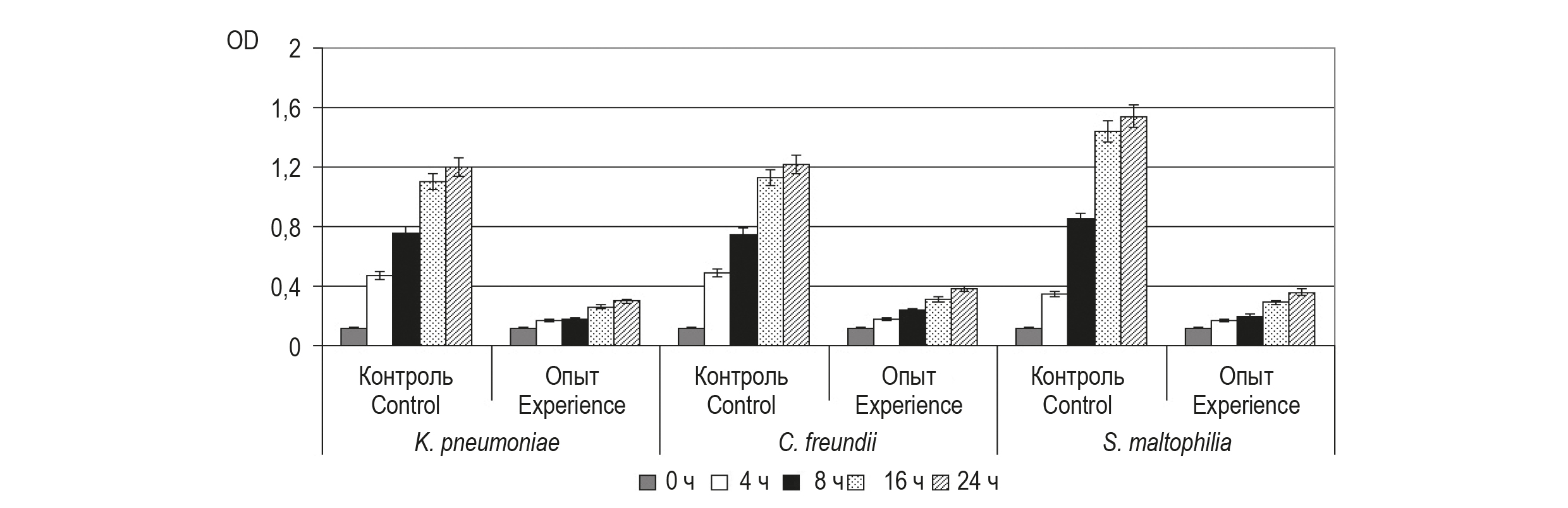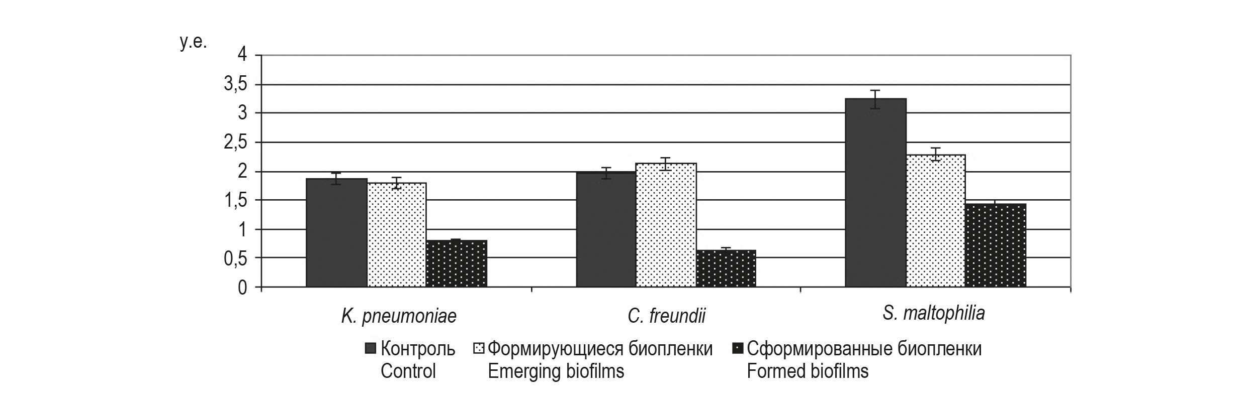 Многие грамотрицательные бактерии разной видовой принадлежности, относящиеся к условно-патогенным микроорганизмам, способны выступать возбудителями бактериальных инфекционно-воспалительных заболеваний разной локализации благодаря наличию у них комплекса факторов патогенности и персистенции. При этом известно, что такие представители семейства Enterobacteriaceae, как Klebsiella pneumoniae и C. freundii, а также неферментирующие грамотрицательные бактерии вида Stenotrophamonas maltophilia, в 10-60% случаев выделяющиеся при различных жизнеугрожающих гнойно-септических состояниях [9, 11, 13], обладают выраженной антибиотикорезистентностью [10, 12]. Кроме того, достаточно часто указанные микроорганизмы характеризуются повышенными адсорбционными способностями к биотическим и абиотическим поверхностям с формированием на их поверхности биопленок, в составе которых они становятся менее доступными для действия на них эффекторов иммунитета и антимикробных средств.
