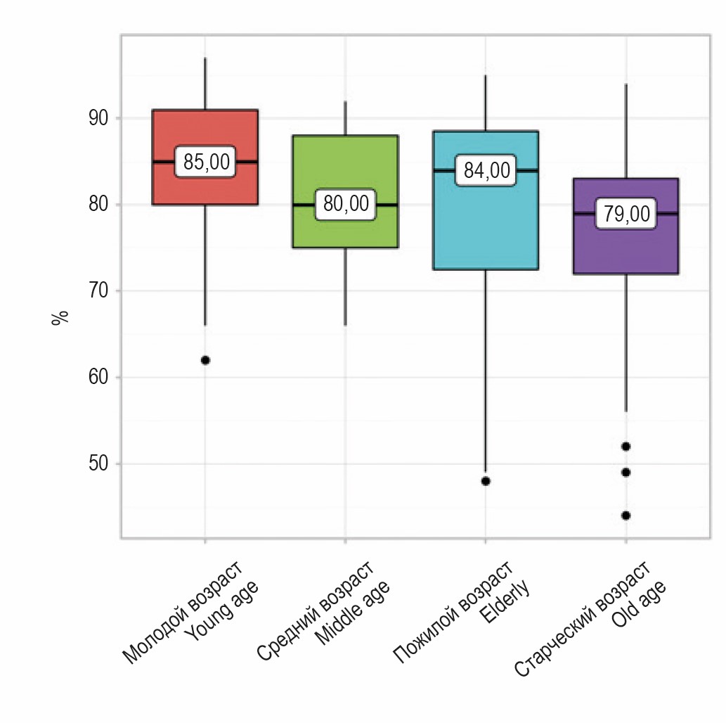 Показатели Indicators | Группа 1 (18-44 года) Group 1 (18-44 years old) n = 37 | Группа 2 (45-59 лет) Group 2 (45-59 years old) n = 13 | Группа 3 (60-74 года) Group 3 (60-74 years old) n = 26 | Группа 4 (75-89 лет) Group 4 (75-89 years old) n = 27 | p |