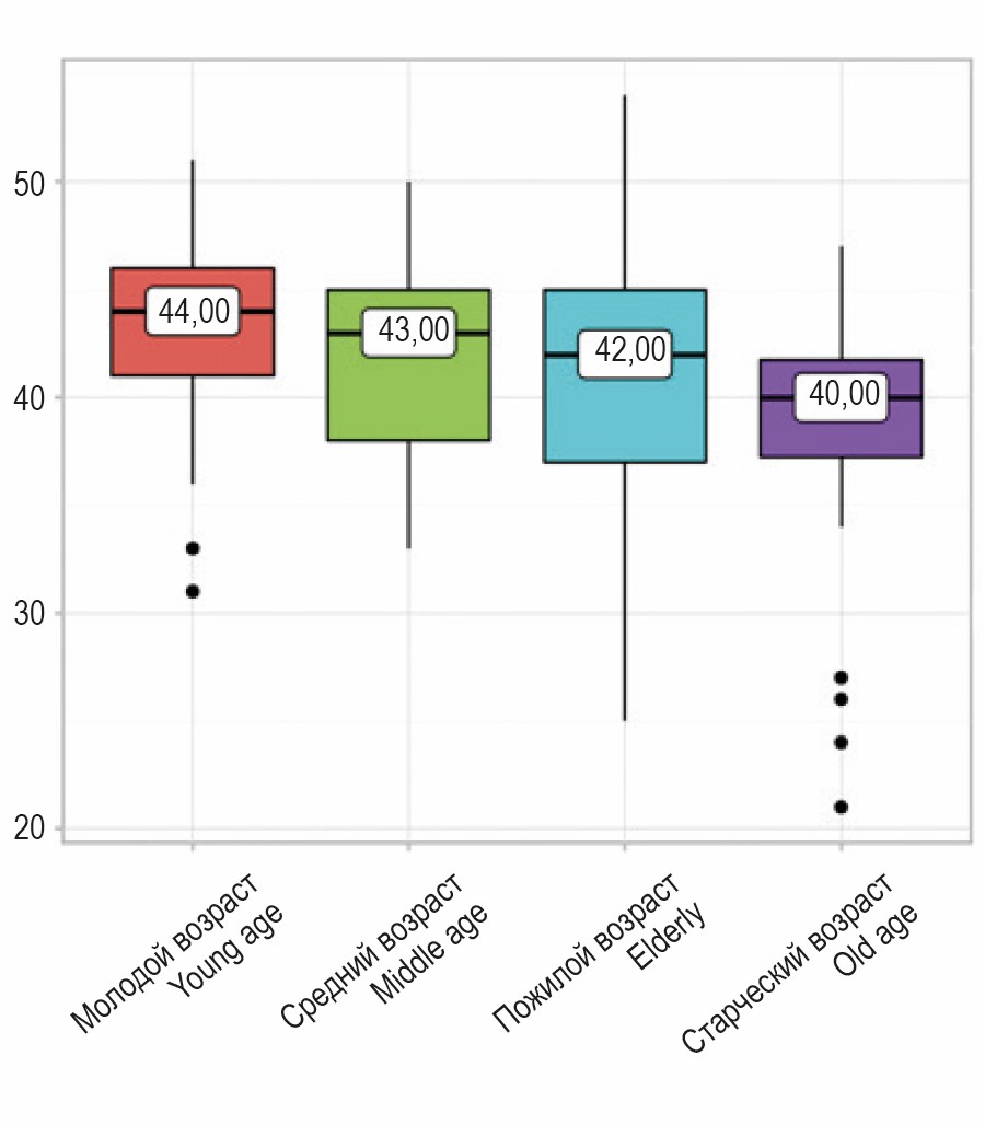Абсолютное содержание НГ в периферической крови обследуемых групп значимо не отличалось (95% ДИ был в пределах 3,05-4,27), при этом процентное отношение НГ (табл. 1) имело достоверную разницу между группами пожилого и старческого возраста (p = 0,019). При оценке %ФАН в зависимости от возраста (рис. 1) были установлены статистически значимые различия между группами молодого и старческого возраста (p = 0,038).