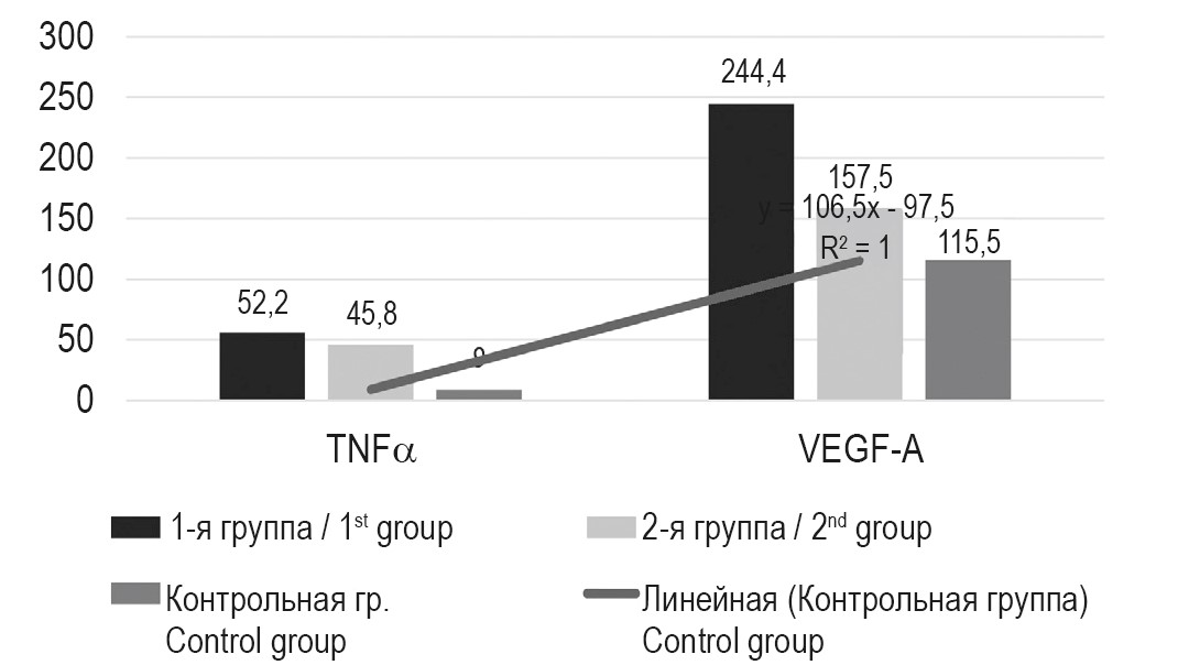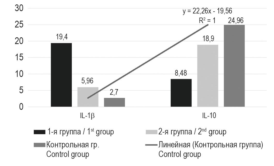 Изучение цитокинов в сыворотке крови пациентов исследуемой группы показало 7-кратное повышение уровня IL-1β у пациентов 1-й группы (19,4±3,4 пг/мл) против контроля – 2,7±0,96 пг/ мл, что носит значимость на уровне p < 0,05 (табл. 2).