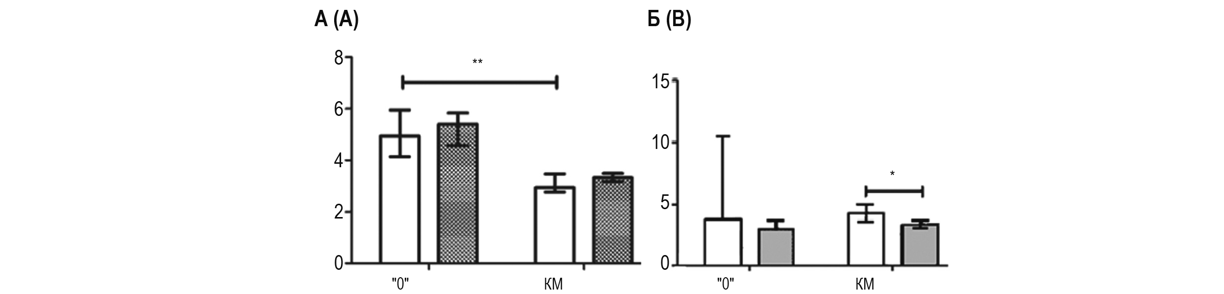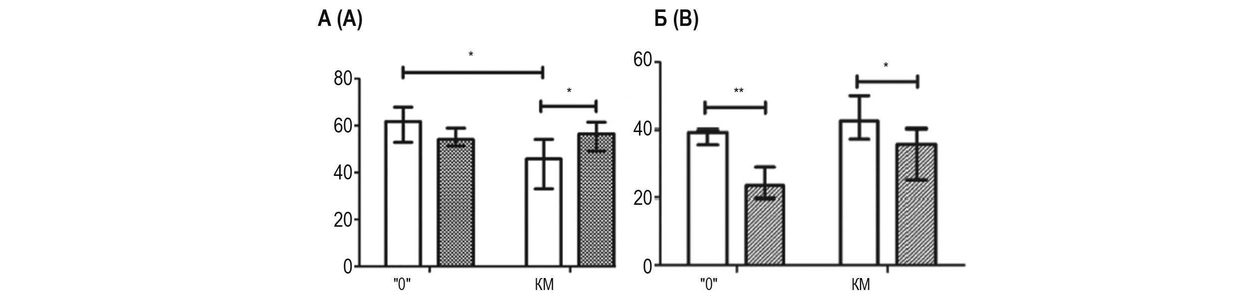 Рисунок 3. Концентрации TNFá в тканях головного мозга крыс линий КМ и «0»: А – дорсальный стриатум, Б – ствол мозга
