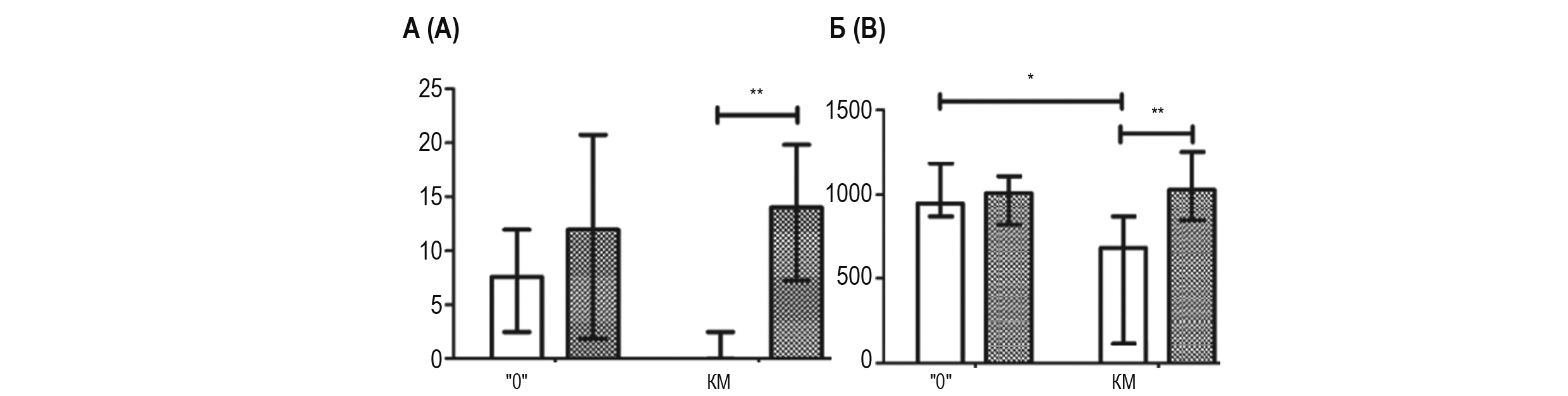 Рисунок 1. Концентрации IL-1â в тканях головного мозга крыс линий КМ и «0»: А – дорсальный стриатум, Б – ствол мозга