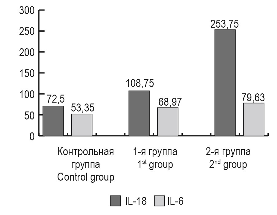 Таким образом, у женщин с риском развития ПЭ (1-я группа) уровень IL-18 был достоверно выше, чем у женщин контрольной группы (p < 0,05), а у женщин, у которых уже развился ПЭ (2-я группа), наблюдалось более выраженное повышение уровня IL-18 (p < 0,001) (рис. 1). Следует отметить, что уровень IL-18 у женщин с ПЭ был достоверно выше, чем у беременных с риском развития ПЭ (p < 0,05). Таким образом, IL-18 может быть ранним предиктором развития преэклампсии. IL-18 – это провоспалительный цитокин, который в основном синтезируется макрофагами и моноцитами и, как полагают, обладает плейотропными свойствами, такими как регулирование как врожденных, так и адаптивных иммунных реакций и стимуляция иммунитета Th1.
