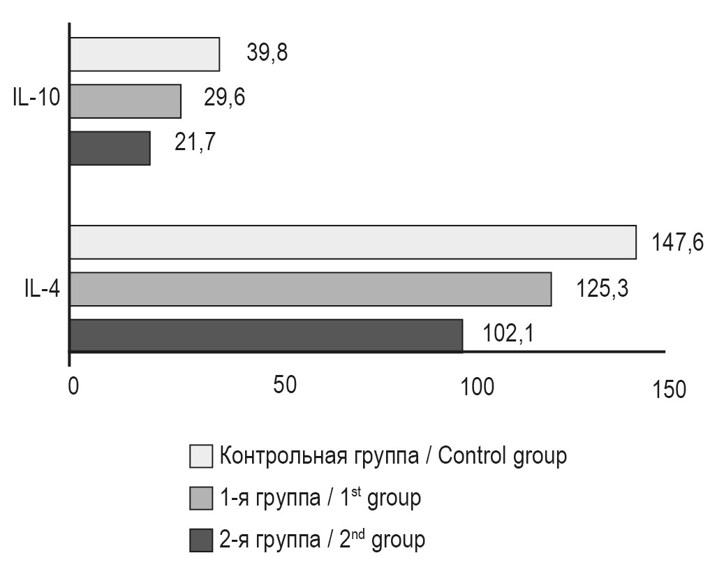 Кроме провоспалительных цитокинов, нами были изучены показатели противовоспалительных цитокинов, которые играют также немаловажную роль в развитии воспалительного процесса. Анализ результатов исследований показал, что уровни противовоспалительных цитокинов, IL-4 при развитии ПЭ достоверно снижаются (рис. 3).