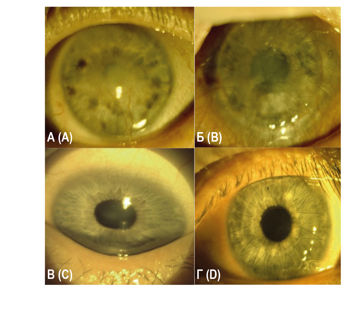 Примечание. A – пациент группы «высокого риска» до хирургического лечения: васкуляризированное рубцовое помутнение роговицы в исходе герпетического кератита; Б – пациент группы «высокого риска» через 6 месяцев после хирургического лечения: хроническая эндотелиально-стромальная реакция отторжения, активная неоваскуляризация; В – пациент группы «низкого риска» до хирургического лечения: кератоконус III-IV стадии, клиническое отсутствие считается признаком воспаления глаза и васкуляризации роговицы; Г – пациент группы «низкого риска» через 6 месяцев после хирургического лечения: прозрачный трансплантат без признаков реакции отторжения.