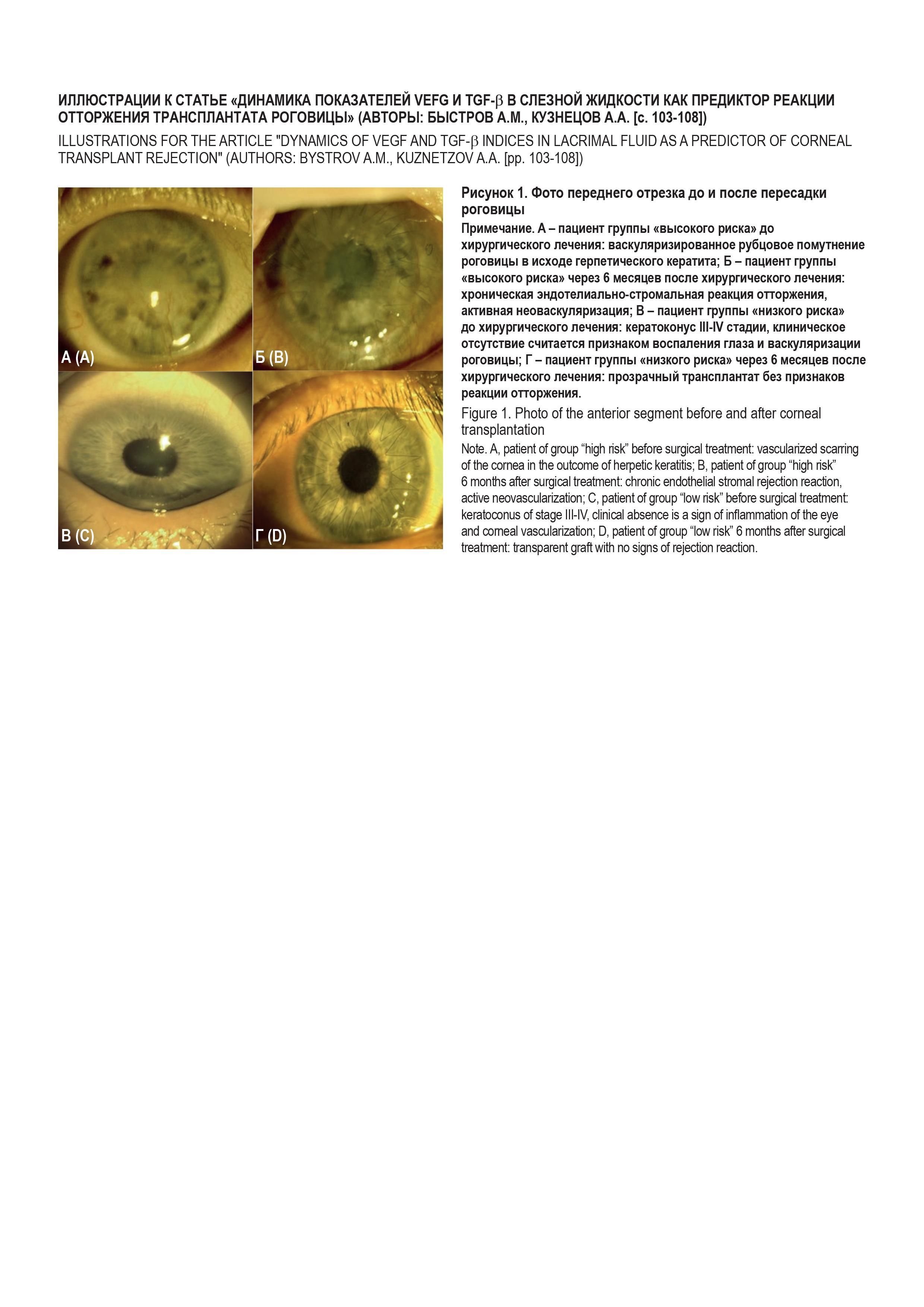 ILLUSTRATIONS FOR THE ARTICLE "Dynamics of VEGF and TGF-â indices in lacrimal fluid as a predictor of corneal transplant rejection" (AuthorS: Bystrov A.M., Kuznetzov A.A. [pp. 103-108])