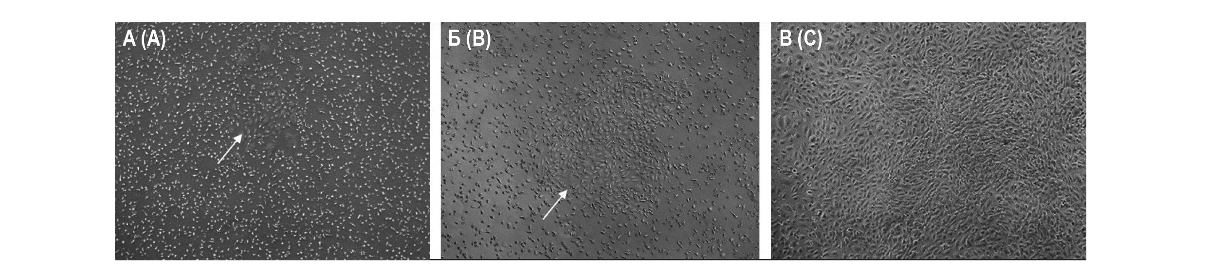 До 8 суток клетки на культуральных планшетах визуально не детектировались. Через 10-18 дней зарегистрировано начало образования колоний с типичной морфологией «булыжной мостовой» (рис. 1А, Б). Пролиферирующие колонии сливались между собой, постепенно вытесняя остальные слабо адгезированные гемопоэтические клетки (рис. 1В).