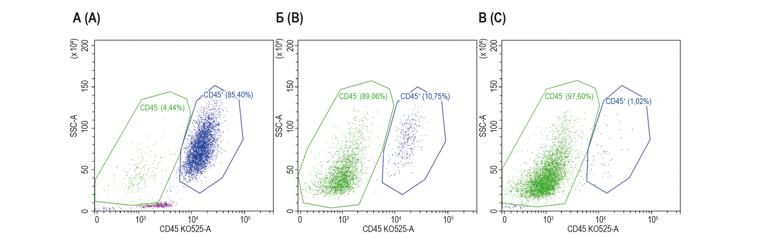 Рисунок 2. Типичные гистограммы распределения популяций CD45+ и CD45- в культуре в зависимости от суток культивирования: А – 11 суток культивирования; Б – 15 суток культивирования; В – 18 суток культивирования (проточная цитометрия)