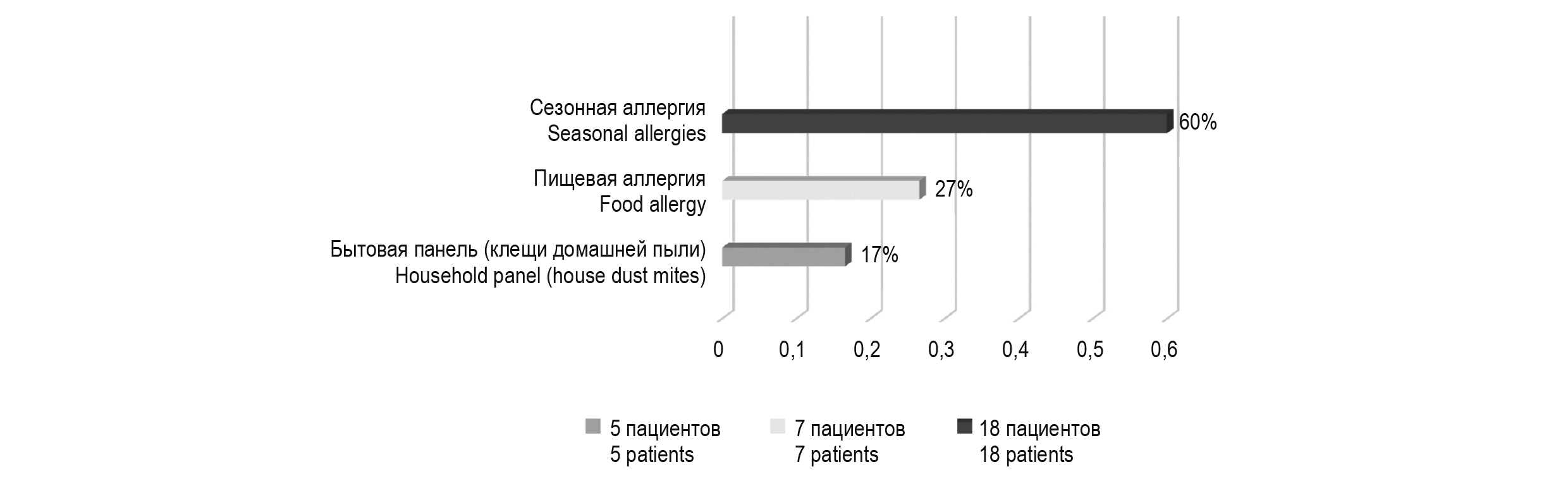 При анализе групп пациентов было установлено, что все 30 пациентов имели сенсибилизацию хотя бы к одному аллергену.