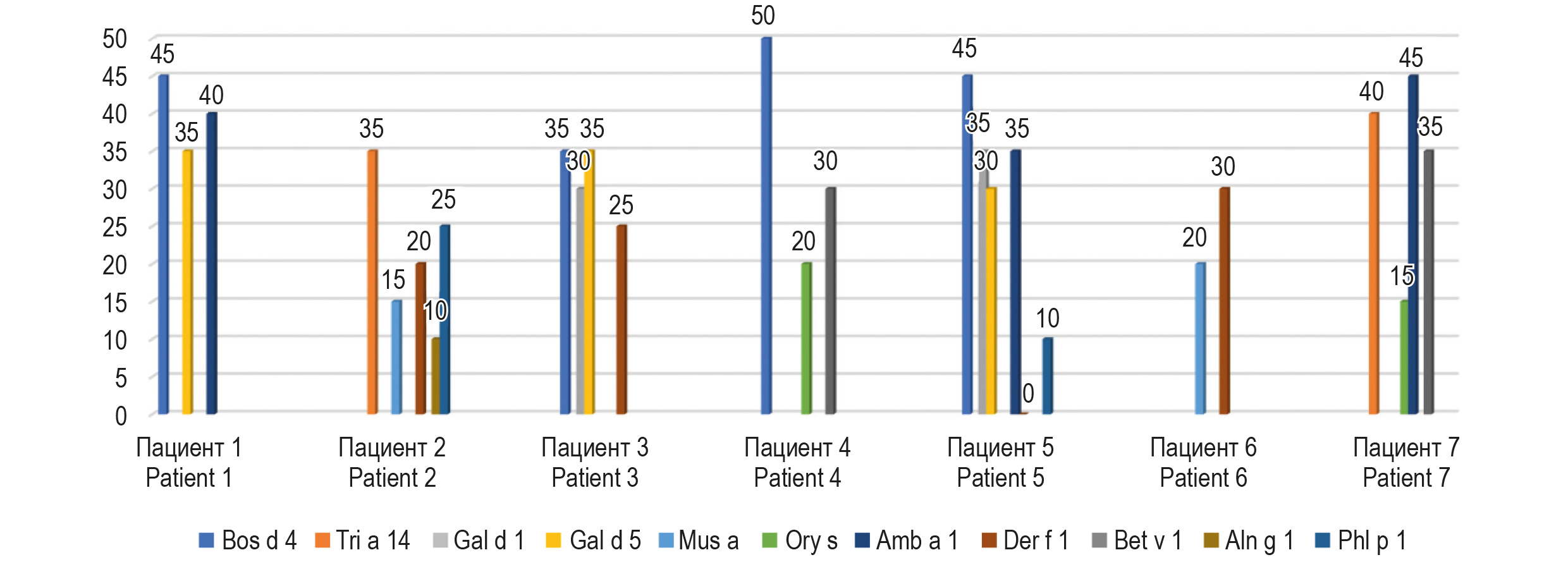– К Gal d 1 наблюдается высокая сенсибилизация у пациента 3 (30%) и пациента 5 (35%). Также высоко распространена сенсибилизация к аллергокомпонентам сорных трав Amb a 1 у пациента 7 (45%) и пациента 2 (15%) (рис. 3, см. 2-ю стр. обложки).