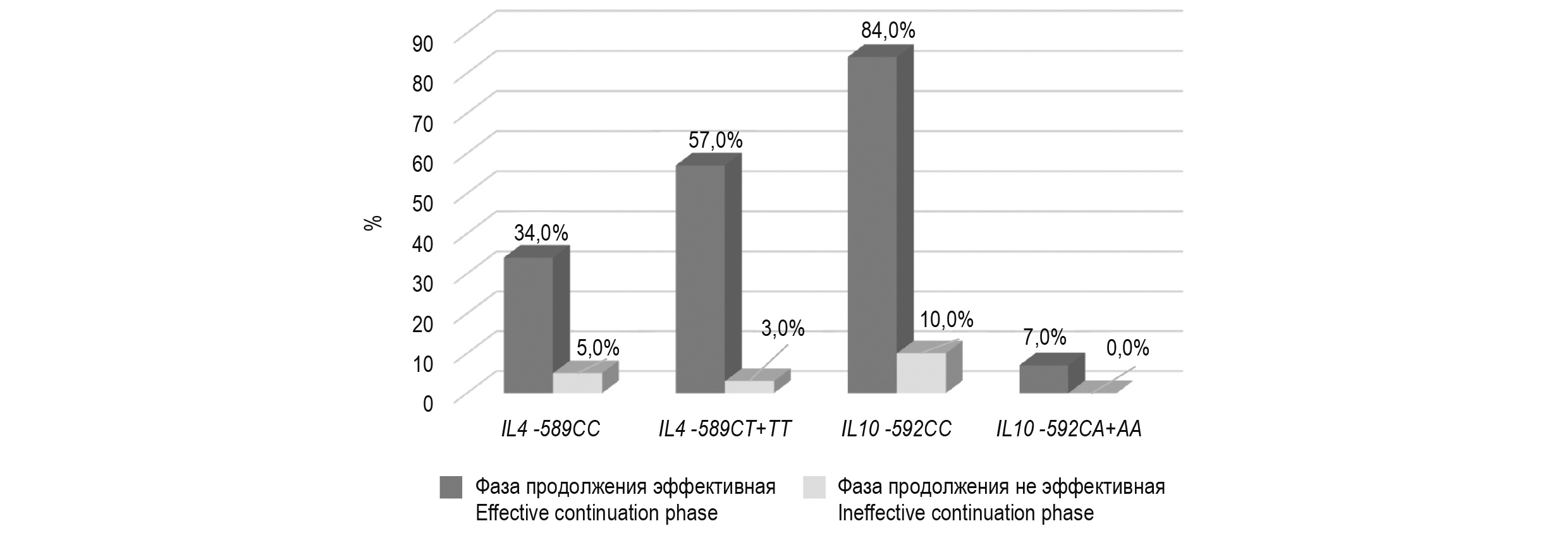 В настоящем исследовании была также проанализирована эффективность лечения в фазе продолжения в зависимости от полиморфизма генов IL4-589 и IL10-592 (рис. 1).