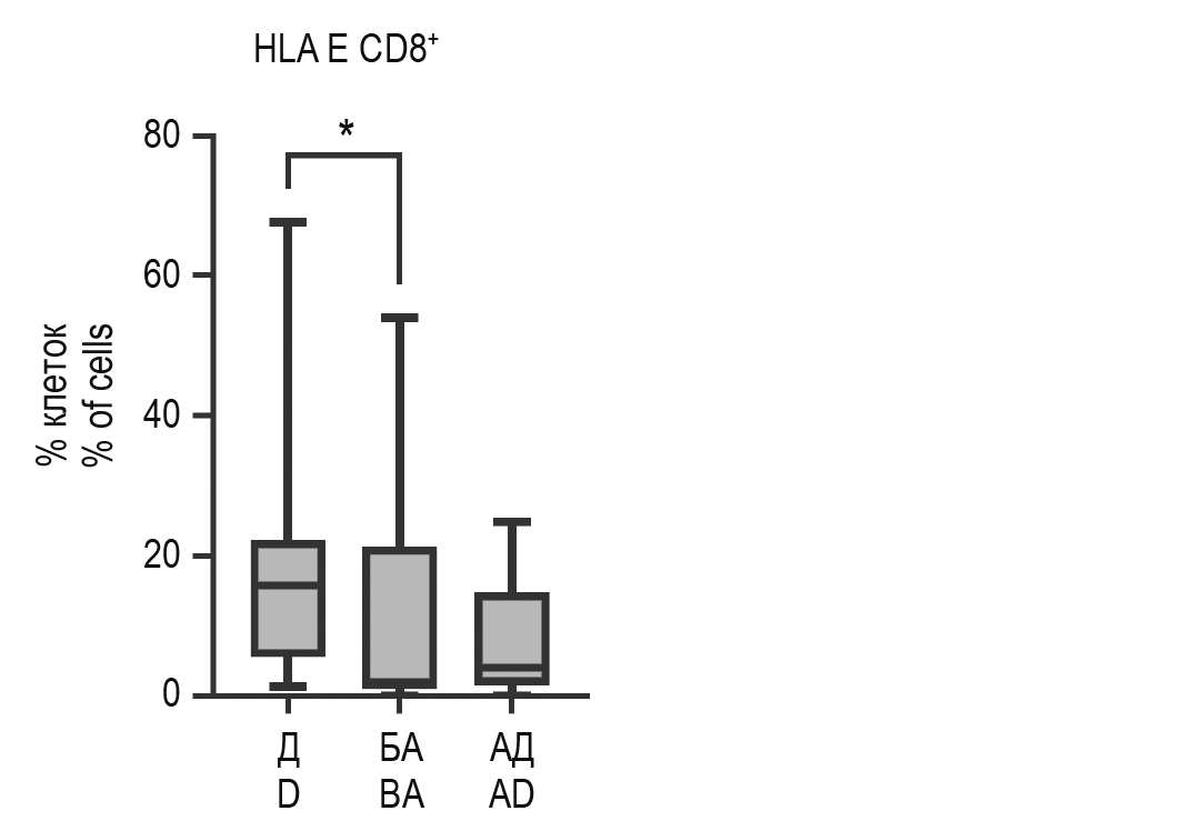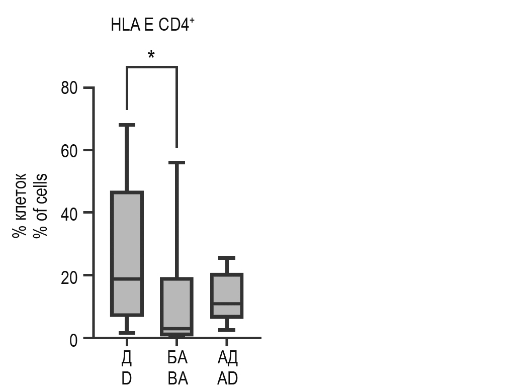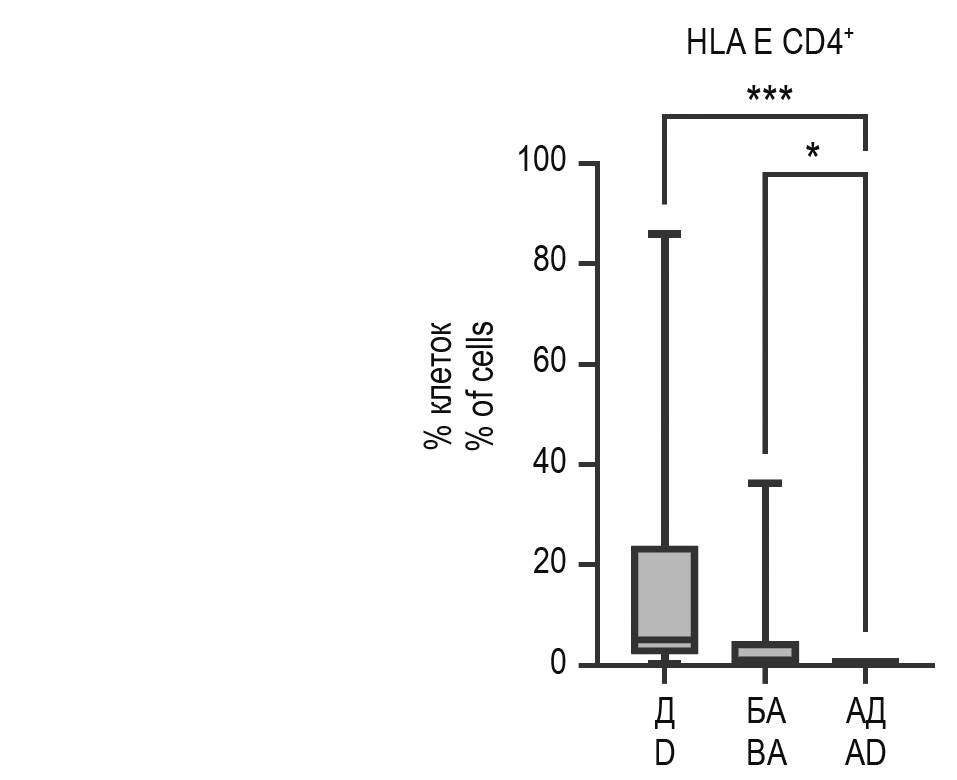 В качестве материала для исследования использовались мононуклеарные клетки периферической крови (МНК ПК) пациентов с аллергическими заболеваниями, находившихся на лечении в клинике иммунопатологии НИИФКИ, и соматически здоровых доноров, после подписания указанными лицами информированного согласия. МНК ПК с БА (n = 19) и АтД (n = 7) и условно здоровых доноров (n = 16) выделяли из периферической крови в градиенте плотности фиколл-урографина (1,077 г/мл). Затем клетки окрашивали моноклональными антителами, конъюгированными с флюорохромами: анти-CD3-APC, анти-CD4-APC-Cy7, анти-CD-14-FITC и анти-HLA-E-PerCP/Cy5. Фенотип клеток анализировали на проточном цитофлуориметре FACS Canto II (BD Biosciences, США). Анализ проводился с помощью GraphPad Prism 9.3.1, с использованием критерия Краскела–Уоллиса. Значение p (p < 0,05) считалось минимальным критерием для статистической значимости.