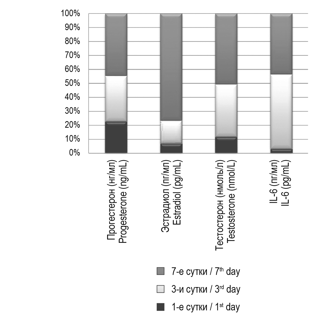 Исследование одобрено Междисциплинарным этическим комитетом ФГБОУ ВО ТГМУ Минздрава России (протокол № 9 от 16.05.2022 г.). Использовали постоянную линию тучных клеток человека HMC-1 (Human mast cell, ATCC). Биомассу ТК наращивали до эксперимента в среде IMDM (модифицированная по Дульбекко среда Игла, Sigma-Aldrich, США) с добавлением 20%-ной эмбриональной бычьей сыворотки FBS (Himedia, Индия), смеси заменимых аминокислот MEM NEAA (Gigbo, США), смеси незаменимых аминокислот MEM EAA (Sigma-Aldrich, США), 1 мМ пирувата натрия, 100 ед/ мл пенициллина и 100 мкг/мл стрептомицина (Gigbo, США). Затем клетки рассаживали в 6-луночный планшет с тремя видами сред: № 1 – содержала среду IMDM с добавками, описанными выше; среда № 2 – IMDM c добавками и гормонами – 7,5 мкг/мл дидрогестерона (АО «Верофарм», Россия), 0,00625 МЕ/мл лютеинизирующего гормона (Merck Serono Europe Ltd., Великобритания), 0,0125 МЕ/ мл фолликулостимулирующего гормона (Merck Serono Europe Ltd., Великобритания) и 1,25 мкг/мл эстрадиол (Delpharm Lille SAS, Франция) имитировала содержание гормонов в фолликулярной жидкости во время овуляции у здоровых доноров; среда № 3 – среда IMDM с добавками и гормонами – 0,00625 МЕ/ мл лютеинизирующего гормона, 0,0125 МЕ/мл фолликулостимулирующего гормона и 2,5 мкг/мл эстрадиол и дегидроэпиандростерона 5 мкг/мл, имитировала содержание гормонов в фолликулярной жидкости во время овуляции, как у пациенток с синдромом поликистозных яичников. Состояние клеток определяли с помощью флуоресцентных красителей с последующей проточной цитометрией перед посадкой клеток через 3 и 7 суток. Тучные клетки собирали из лунок планшета, осаждали центрифугированием при 500 g в течение 5 мин при комнатной температуре. К осадкам клеток из индивидуальных лунок добавляли 100 мкл смеси красителей на фосфатном буфере (Sigma-Aldrich, США): 4’,6 диамидино-2-фенилиндол (Sigma-Aldrich, США) в конечной концентрации 1 мкг/ мл для окрашивания мертвых клеток, H2DCFDA (Sigma-Aldrich, США) в конечной концентрации 10 мкг/мл для окрашивания клеток с функционально-активными митохондриями, TO-PRO-3™ (Thermo Scientific, США) в конечной концентрации 1 мкМ для окрашивания апоптотических клеток. Окрашивание производили в течение 10 мин при комнатной температуре. После этого суспензии анализировали на проточном цитофлуориметре CytoFLEX S (Beckman Coulter, США), подключенном к компьютеру с лицензионным программным обеспечением CytExpert (v. 2.6, Beckman Coulter, США). Для анализа использовали 10 тыс. событий. Смену среды проводили каждые 3 суток. Среду после культивирования исследовали на содержание эстрадиола, прогестерона, тестостерона, IL-6.