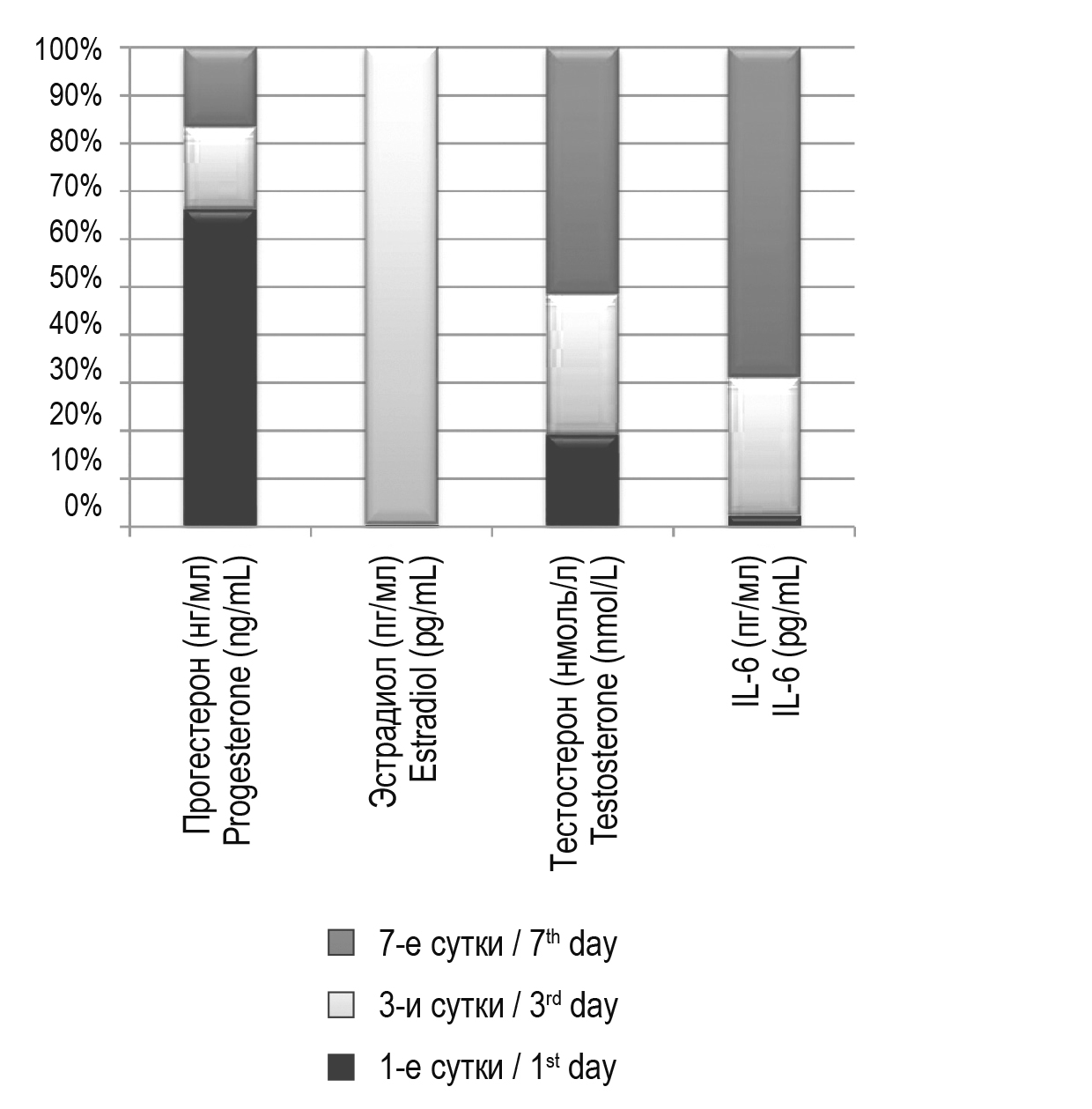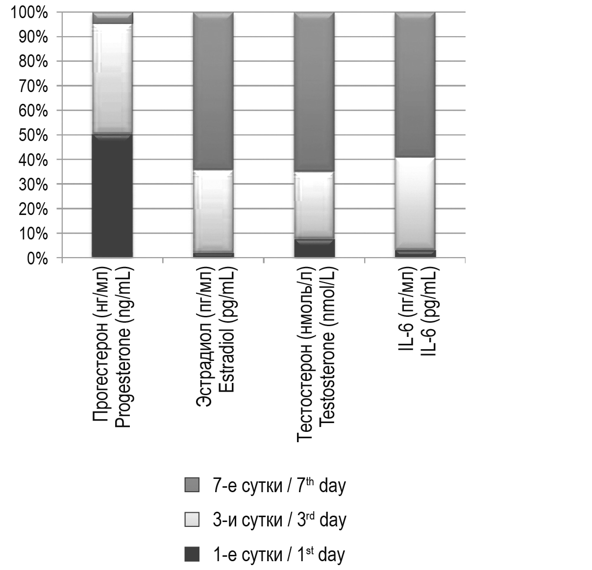 Показатели практически всех гормонов в культуре ТК изменялись в зависимости от микроокружения ТК и времени продолжения эксперимента. Показатель прогестерона не изменился в среде № 1 без добавления гормонов и в среде № 3 с добавлением гормонов как при СПКЯ. В среде № 2 с созданием уровня гормонов как у здоровых доноров на 3-и и 7-е сутки произошло снижение показателя прогестерона в 4 раза в сравнении с исходными данными, но он оставался в 2 раза выше, чем в среде № 3. Все данные по содержанию прогестерона в культурах ТК могут свидетельствовать об отсутствии дополнительной секреции гормона тучными клетками в течение 7 суток нашего эксперимента.