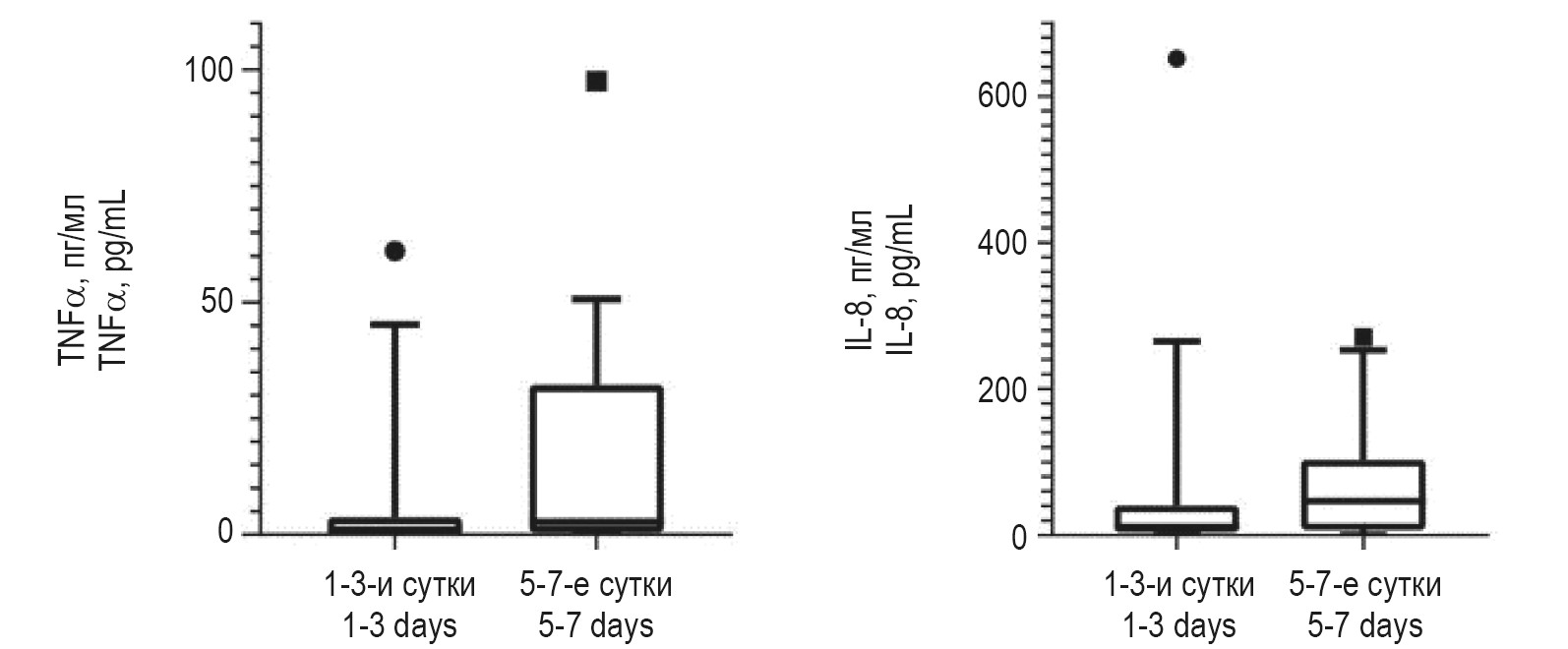 Рисунок 1. Уровни TNFα и IL-8 на 1-3-и и 5-7-е сутки манифестации внутримозгового кровоизлияния