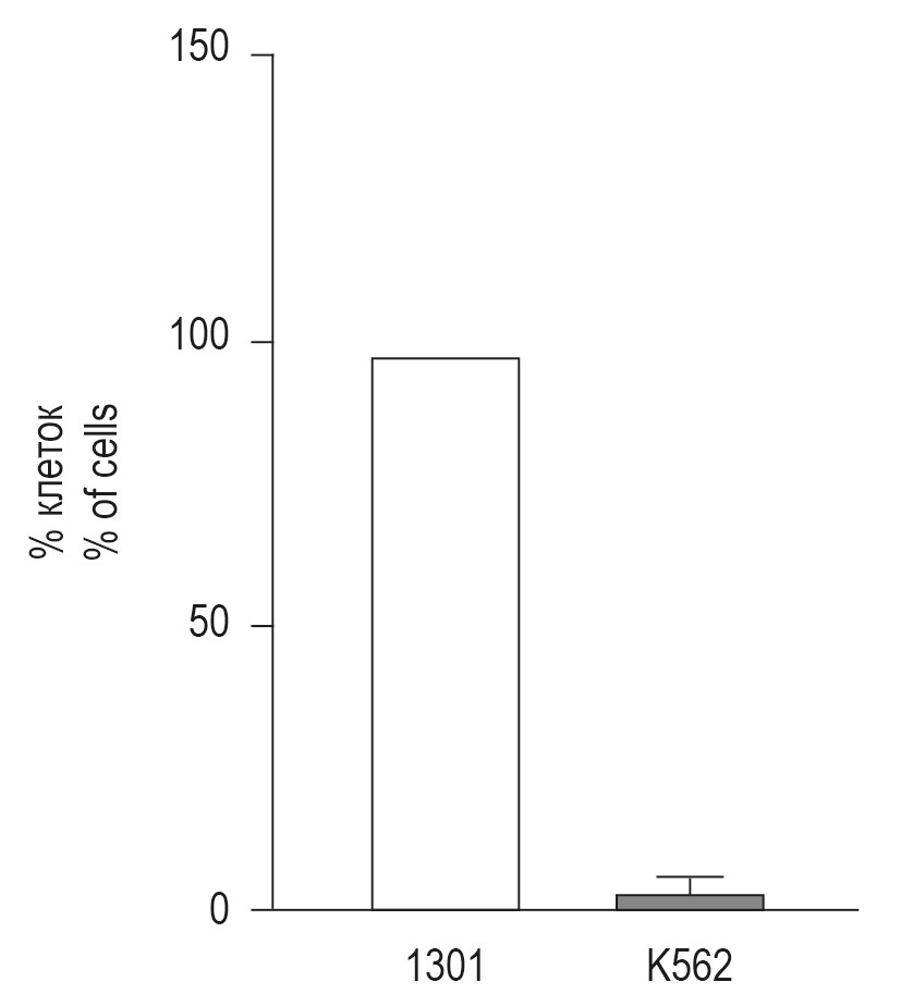 Полученные результаты соответствуют литературным данным, было показано, что К562 слабо экспрессирует маркер CD44 [5]. Вероятно, различия по экспрессии ряда поверхностных маркеров внутри данной клеточной линии, проявляющиеся в относительном количестве клеток, экспрессирующих определенную молекулу, связано с гетерогенностью клеточной линии [1, 5, 7]. В то же время клетки линии 1301 гетерогенности по экспрессии CD44 не проявляли.