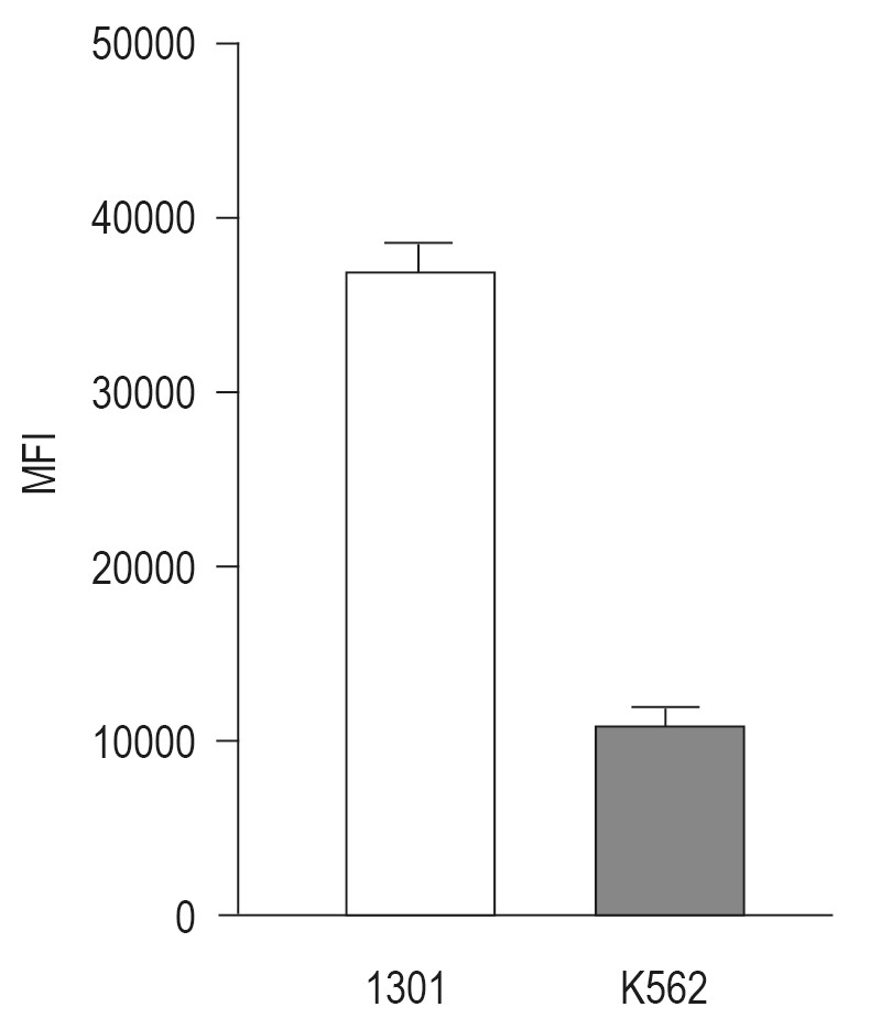 Анализ среднего уровня флуоресценции поверхностного маркера (рис. 2) на CD44+ клетках также выявил, что плотность экспрессии данного маркера также была очень высокой в случае клеток линии 1301, тогда как на линии K562 наблюдаемый нами уровень экспрессии был приблизительно в три раза ниже.