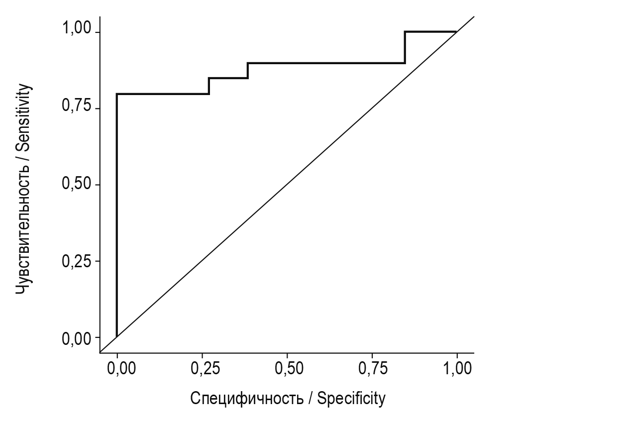 В унивариантном анализе логистической регрессии для дифференциальной диагностики между III и IV стадией РЯ статистическую значимость совместно демонстрировали β-catenin (ОР 0,718 95% ДИ 0,503-1,024, p = 0,047) и WISP1 плазмы крови (ОР 0,980 95% ДИ 0,968-0,993, p = 0,002). Площадь под кривой (AUC) такой модели составила 0,883, и IV стадия РЯ может быть диагностирована с 91,3% вероятностью (Spec. = 1,00, Sens. = 0,80) (рис. 1). Риск развития РЯ IV стадии возрастает при одновременно повышенных уровнях β-catenin (более 28,1 пг/ мл) и WISP1 (более 445 пг/мл) в плазме крови (R2 = 0,451, χ2 = 28,4, р = 0,001).