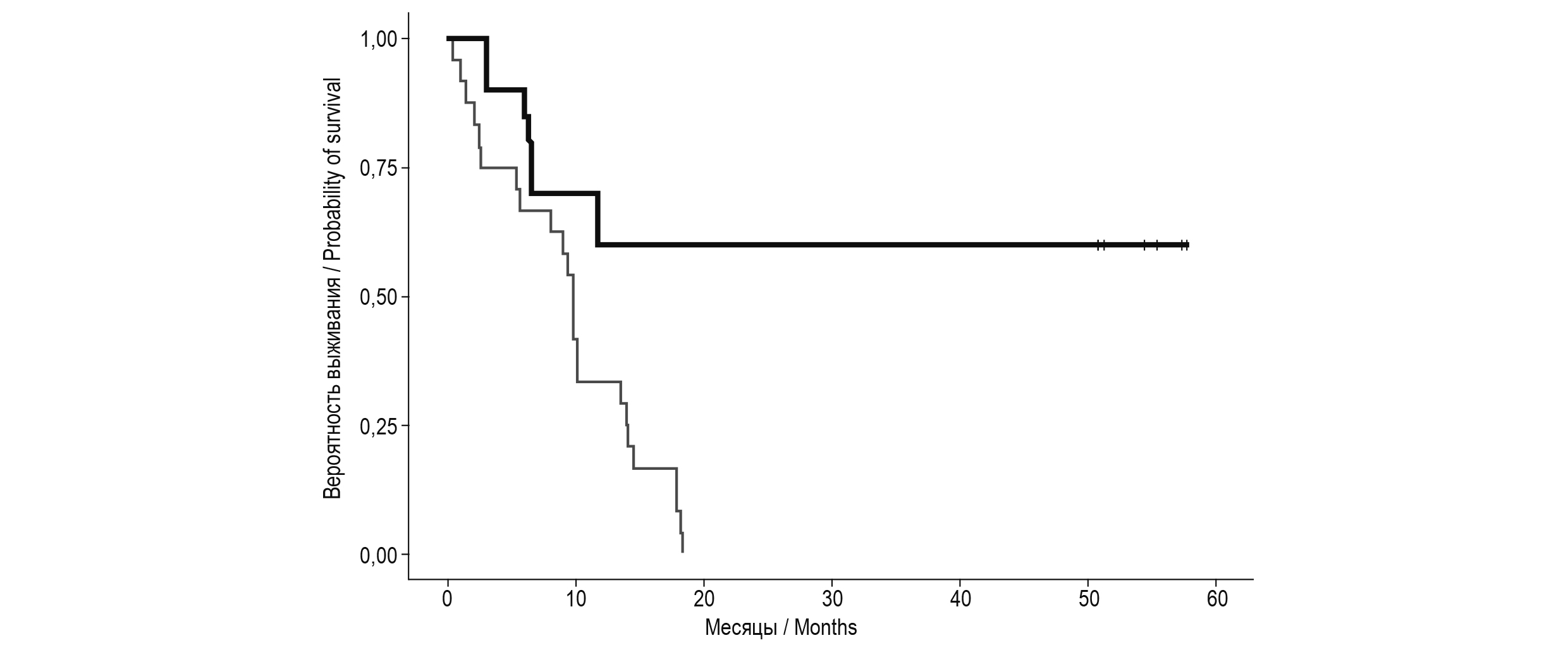 В динамическом наблюдении на фоне и после завершения химиотерапии по схеме ТР пациенты были разделены на 2 группы: I – прогрессирование на фоне ХТ (платинорезистентная группа) и ранний рецидив; II – рецидив после 6 и более месяцев после окончания ХТ (платиночувствительная группа).