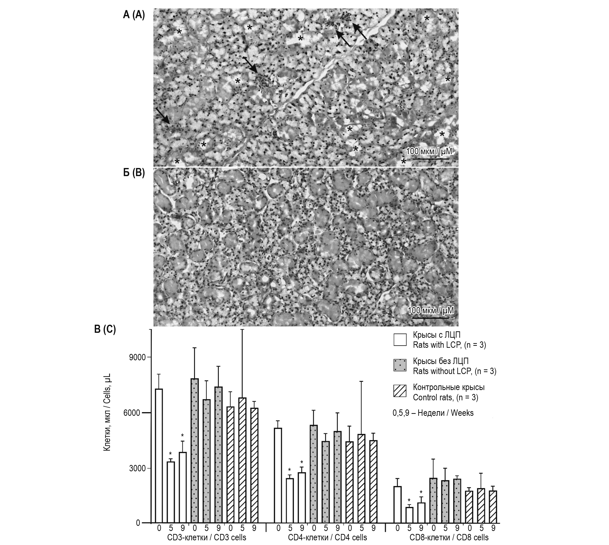 Примечание. А, Б – поперечные срезы поднижнечелюстных слюнных желез крыс, иммунизированных белками, выделенными из гомогената слюнных желез мыши. А – слюнная железа с очагами гиперплазии (стрелки), разрушением протокового эпителия и расширением протоков (звездочки); Б – слюнная железа без повреждений. Окраска H&E. В – количество СD3, CD3CD4, CD3CD8-лимфоцитов в крови крыс, иммунизированных белками, выделенными из гомогената слюнных желез мыши. Данные представлены как среднее (n = 3) ±SD. * – статистически значимо по отношению к значению до иммунизации (тест повторных измерений ANOVA test, p < 0,05). ЛЦП – лимфоцитопения.