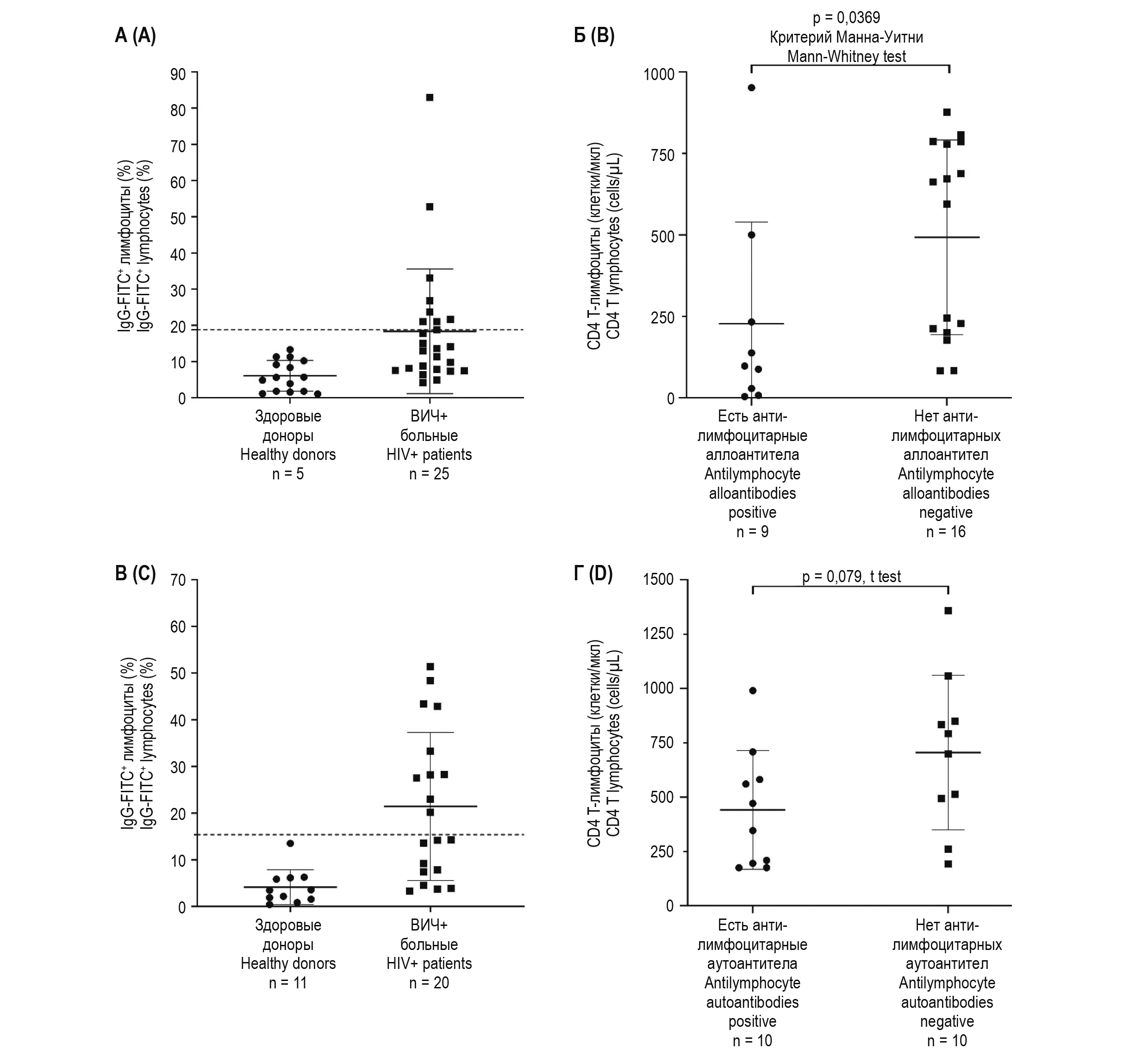 Аутоантитела против лимфоцитов, мембраносвязанные и свободные, были изучены у 20 ВИЧ-инфицированных пациентов (45% из них находились на АРВТ по схеме 1-го ряда EFV+3TC+TDF) и 11 здоровых людей. Уровень мембраносвязанных аутоантител к лимфоцитам выражали в % лимфоцитов, несущих поверхностные аутоантитела класса G. Пороговое значение, выше которого образец считали положительным на мембраносвязанные аутоантитела, составило 12,8% лимфоцитов. Мембраносвязанные антилимфоцитарные аутоантитела выявлены у 10% ВИЧ-инфицированных людей.