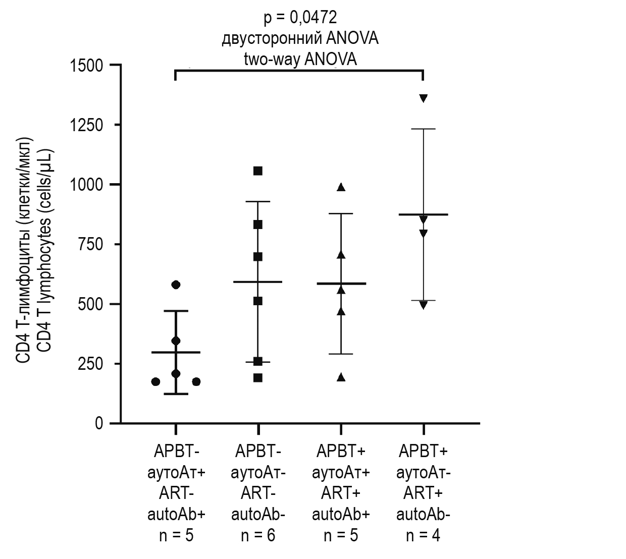 Количество CD4 Т-лимфоцитов у ВИЧ-инфицированных, имеющих антилимфоцитарные аутоантитела, оказалось ниже, чем у ВИЧ-инфицированных, не имеющих данных аутоантител (рис. 1Г). Однако различие количества CD4 Т-клеток не было значимым: p = 0,079, t test (рис. 1Г). Известно, что антиретровирусная терапия обычно эффективна у большинства пациентов и позволяет восстанавливать и поддерживать количество CD4 Т-лимфоцитов [2]. Чтобы оценить влияние этих двух факторов (АРВТ и аутоантител) на количество CD4 Т-лимфоцитов был применен двухфакторный дисперсионный анализ (two-way analysis of variance, ANOVA). ВИЧ-позитивные пациенты были поделены на четыре группы: пациенты, не принимающие АРВТ и имеющие антилимфоцитарные аутоантитела (АРВТ-, аутоАт+), пациенты, не принимающие АРВТ и не имеющие антилимфоцитарных аутоантител (АРВТ-, аутоАт-), пациенты, принимающие АРВТ и имеющие антилимфоцитарные аутоантитела (АРВТ+, аутоАт+), пациенты, принимающие АРВТ и не имеющие антилимфоцитарных аутоантител (АРВТ+, аутоАт-). Наименьшее число CD4 Т-клеток наблюдалось у больных, имеющих антилимфоцитарные аутоантитела и не принимающих АРВТ, а наибольшее количество CD4 Т-лимфоцитов в крови у людей, находящихся на АРВТ и не имеющих антилимфоцитарные аутоантитела (рис. 2). Различия между этими группами значимы (p = 0,047, two-way ANOVA). Двухфакторный дисперсионный анализ выявил, что и аутоантитела к лимфоцитам и АРВТ оказывают значимое влияние на количество CD4 Т-лимфоцитов в крови (p = 0,045 и p = 0,050 соответственно, two-way ANOVA).