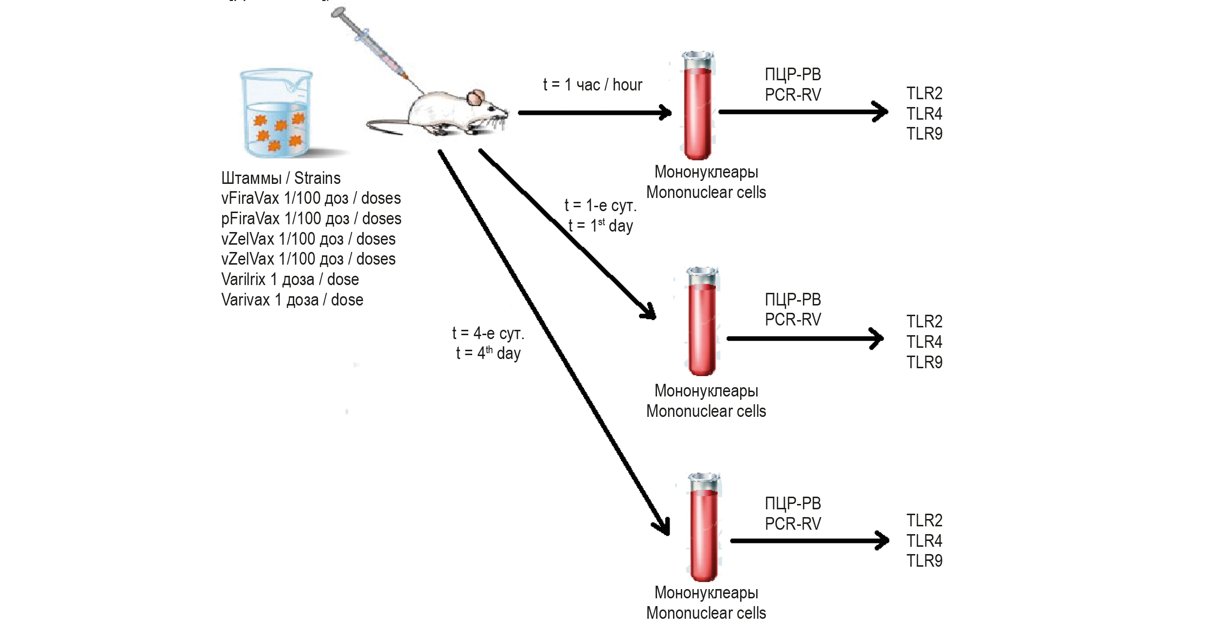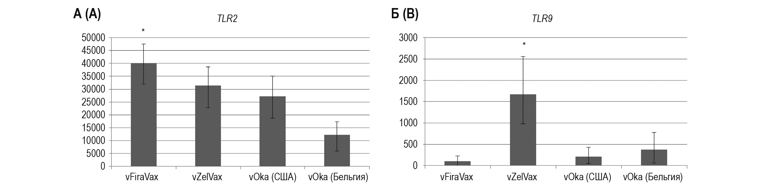 Примечание. vFiraVax, pFiraVax, vZelVax, pZelVax – кандидатные штаммы; Varilrix, Varivax – штаммы коммерческих вакцин; ПЦР-РВ – полимеразная цепная реакция в режиме реального времени; TLR2, TLR4, TLR9 – Toll-подобные рецепторы 2, 4, 9.