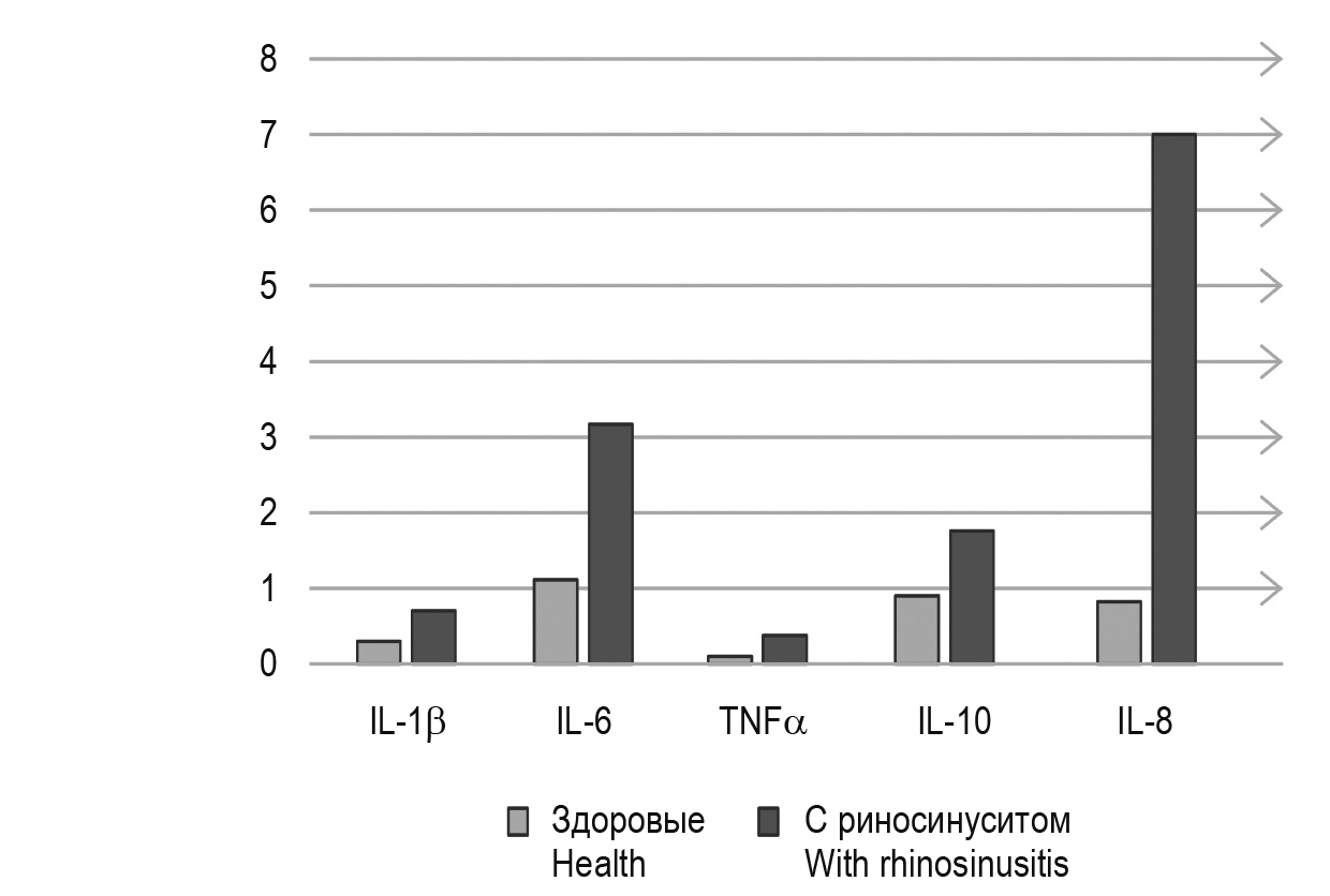 У пациентов с ОРС, перенесших корь, в сыворотке крови выявлен высокий уровень цитокинов, которые выполняют функцию основных иммунорегуляторных медиаторов развития воспалительной реакции, острофазового и иммунного ответа организма. Зарегистрировано повышение в сыворотке крови IL-1β в 2,35 раза с 0,31 пг/ мл до 0,75 пг/мл, IL-6 в 3,17 раза с 1,11 пг/ мл до 3,17 пг/мл, TNFα в 3,78 раза с 0,1 пг/мл до 0,378 пг/мл, повышение IL-10 в 1,96 раза с 0,9 пг/ мл до 1,764 пг/мл, IL-8 в 9,15 раза с 0,82 пг/ мл до 7,5 пг/мл, что свидетельствует о дисбалансе регулирующих воспаление молекул и остром хроническом воспалительном процессе в полости носа околоносовых пазухах (рис. 1).