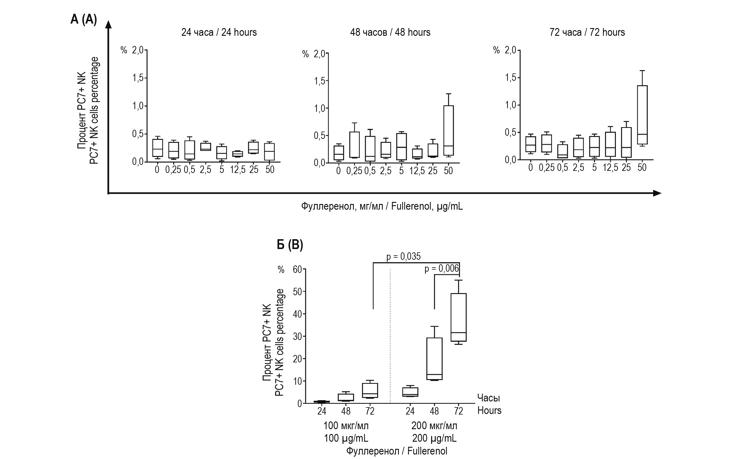 Показано, что в присутствии наночастиц фуллеренола в концентрации 200 мкг/мл и 100 мкг/ мл процент клеток, которые его интернализовали, достигал 50% и 10%, соответственно, однако, низкие концентрации фуллеренола (50, 25, 12,5, 5, 2,5, 0,5 и 0,25 мкг/м) поглощались не более чем 0,3% NK-клеток на 24 ч, 1% на 48 ч и не более чем 1,5% на 72 ч наблюдения.