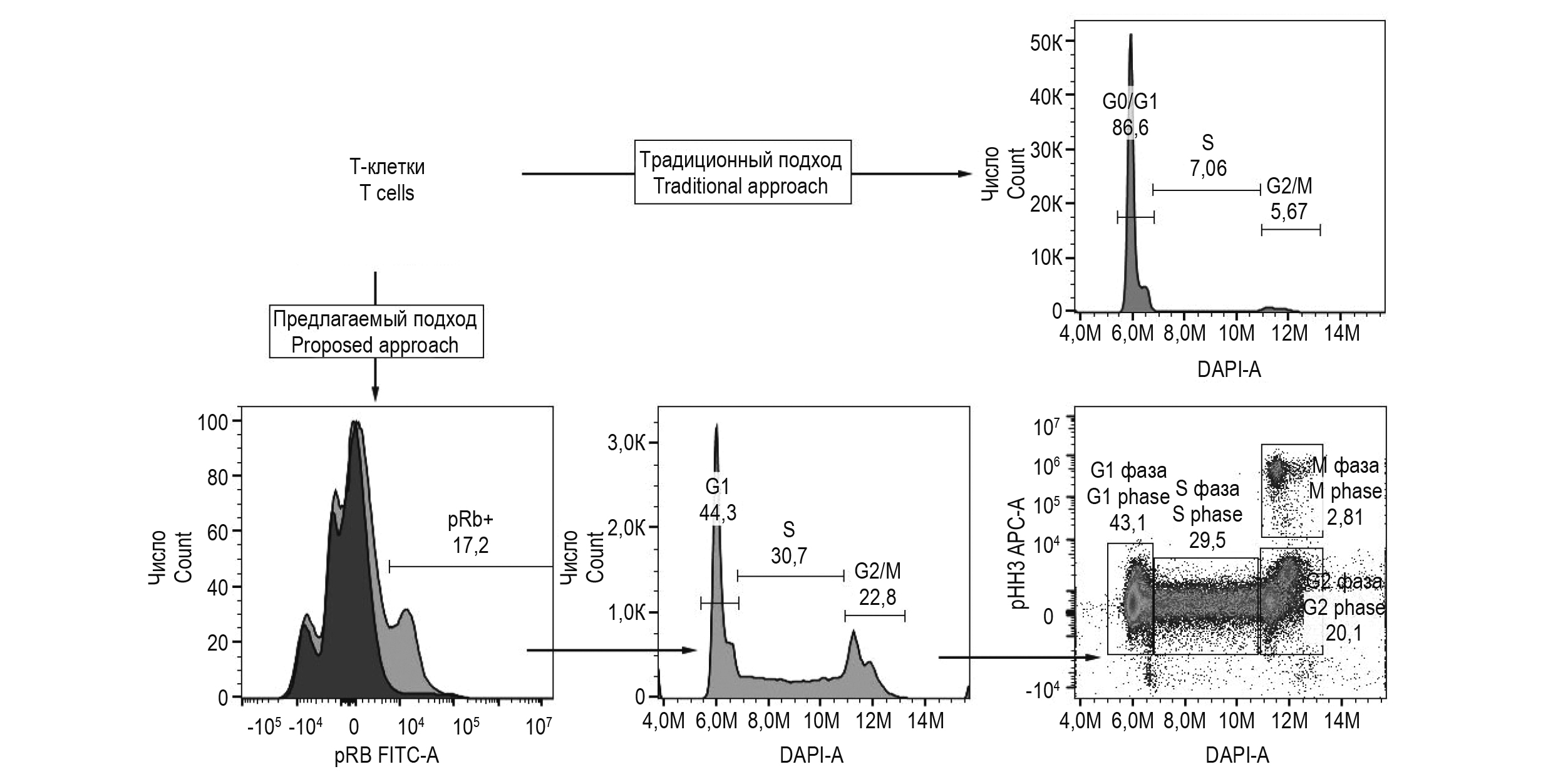 Рисунок 1. Традиционный и предлагаемый подход к анализу клеточного цикла Т-лимфоцитов