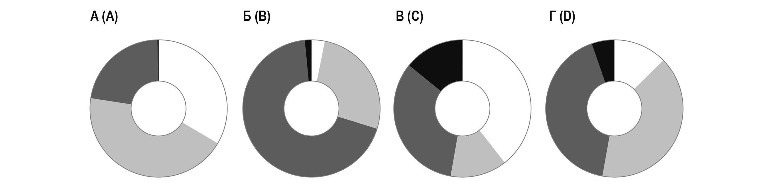 Рисунок 1. Распределение основных субпопуляций Т-лимфоцитов в зависимости от экспрессии CD62L и CD45RA. Примечание. Круговые диаграммы А-Г показывают относительное количество лимфоцитов с фенотипом «наивных» клеток (CD45RA+CD62L+) – белый цвет, клеток центральной памяти (CM, CD45RA-CD62L+) – серый цвет, клеток эффекторной памяти (EM, CD45RA-CD62L-) – темно-серый цвет и терминально дифференцированных CD45RA-позитивных эффекторных клеток памяти (CD45RA+CD62L-) – черный цвет. Круговая диаграмма А показывает распределение фенотипов среди CD3+CD4+, диаграмма Б – среди CD8dimCD4bright, диаграмма В – относительно CD3+CD8+ и диаграмма Г – распределение фенотипов среди CD4dimCD8bright.