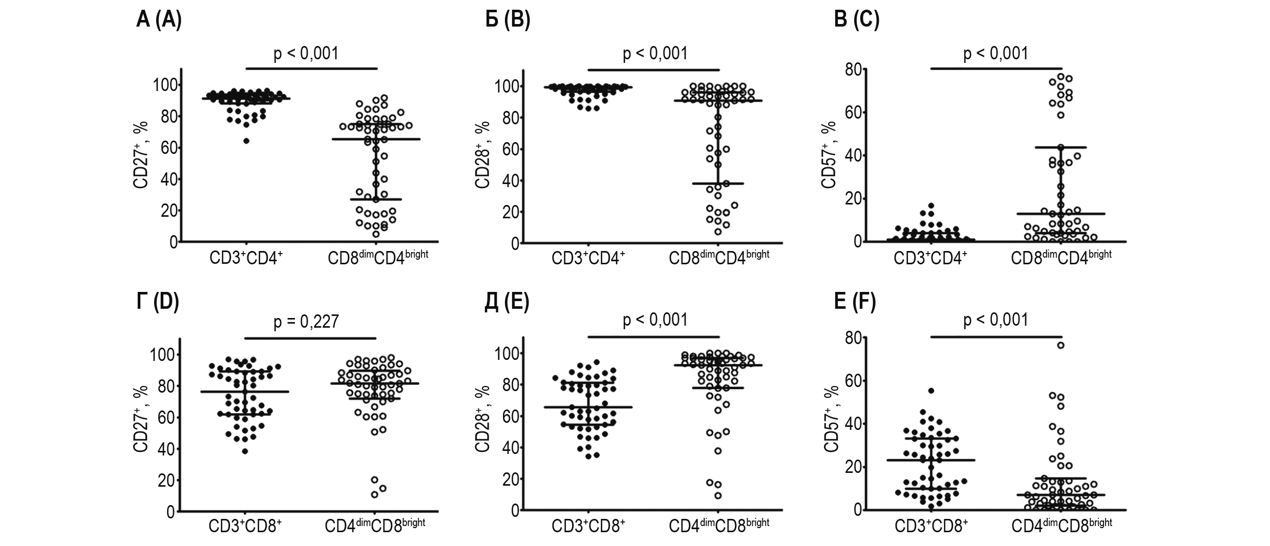 Рисунок 2. Экспрессия CD27, CD28 и CD57 субпопуляциями Т-лимфоцитов с различными паттернами экспрессии маркеров CD4 и CD8. Примечание. Гистограммы А-Е показывают относительное содержание CD3+CD4+, CD8dimCD4bright, CD3+CD8+ и CD4dimCD8bright, экспрессирующих маркеры CD27, CD28 и CD57 соответственно. Черные кружки обозначают клетки CD3+CD4+ и CD3+CD8+ на гистограммах А-В и Г-Е соответственно, белые кружки – клетки CD8dimCD4bright и CD4dimCD8bright на гистограммах А-В и Г-Е соответственно. Результаты представлены в виде медианы и интерквантильного размаха – Me (Q0,25-Q0,75); для полученных сравнения выборок использовали непараметрический U-критерий Манна–Уитни.