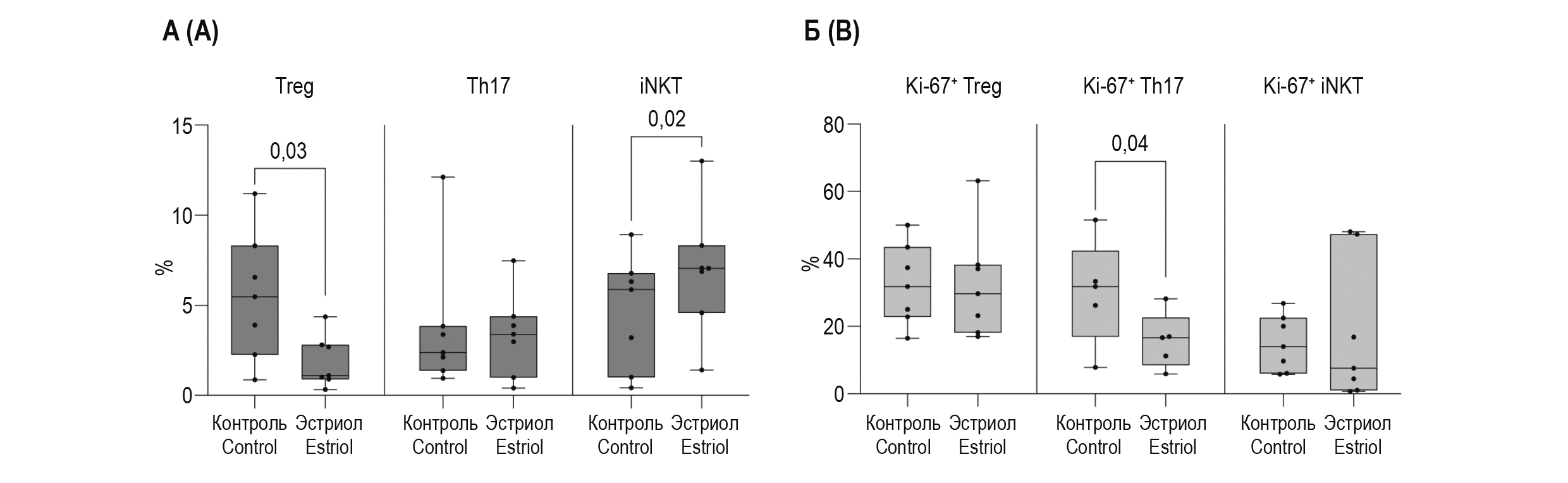 Рисунок 1. Процентное содержание регуляторных клеток (Treg, Th17, iNKT) в культурах тимоцитов, культивировавшихся 72 ч в присутствии CD3/CD28-активирующих частиц и эстриола или без эстриола (контроль) (А); процент Ki-67-экспрессирующих Treg, Th17, iNKT в этих культурах (Б)
