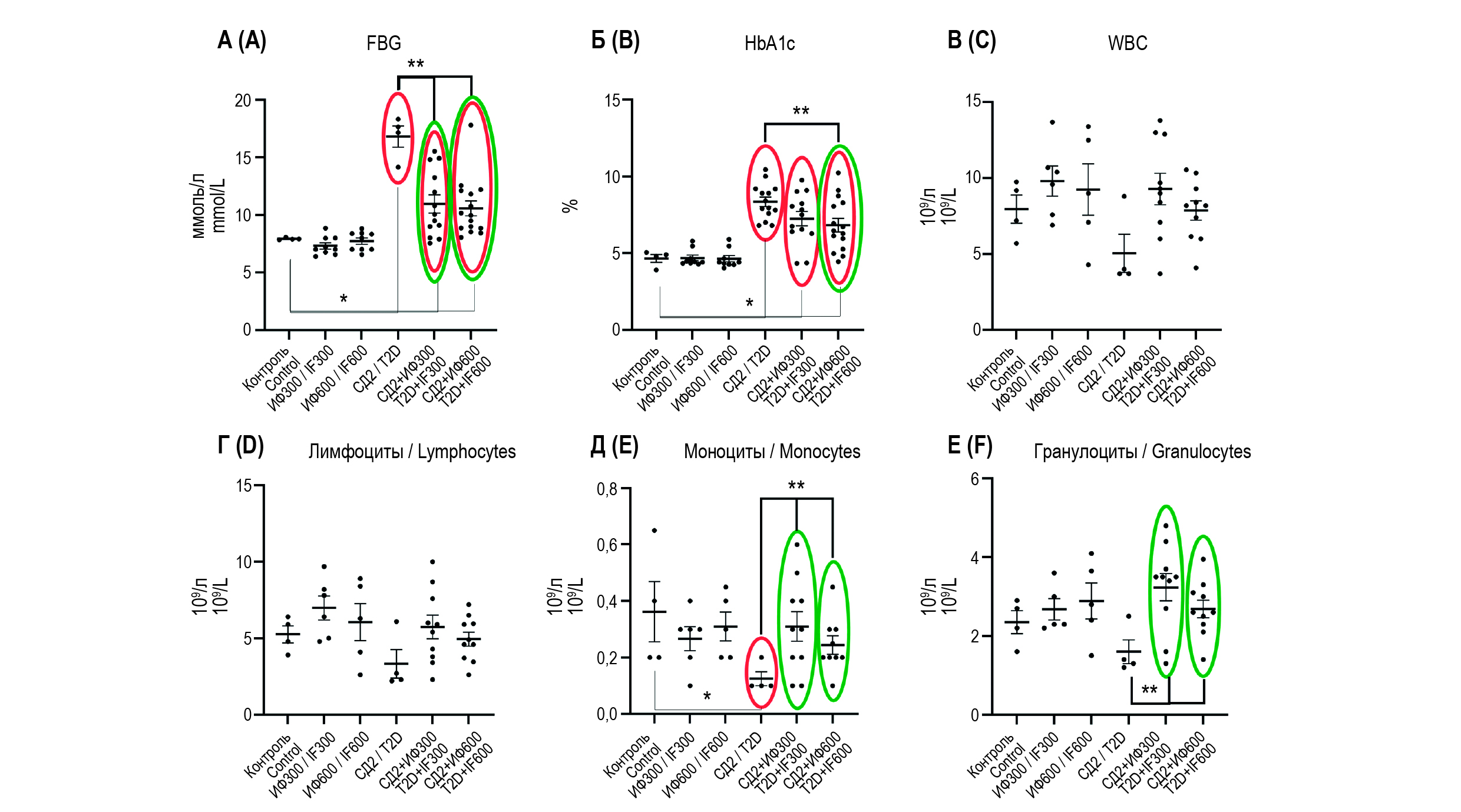 Note. T2D, experimental diabetes type 2; IF, isoflavones; IF300 and IF600, doses of IF of 300 and 600 mg/kg, respectively; FBG (fasting blood glucose), fasting blood glucose concentration; WBC (white blood cell), leukocytes. *, p < 0.05 in comparison with the control group of healthy animals; **, p < 0.05 in comparison with the control group of animals with T2D. The red oval marks the difference from the healthy control, the green one shows the difference between T2D and T2D + IF.