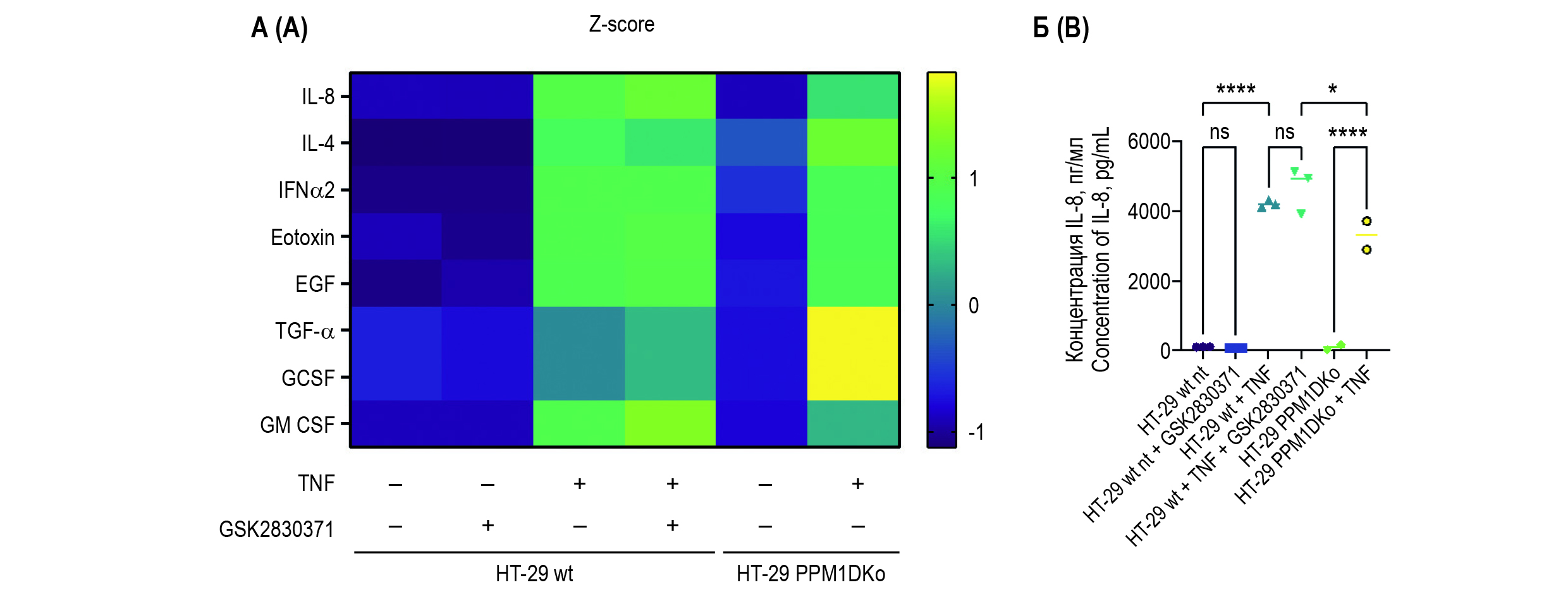 Примечание. А – относительная экспрессия различных цитокинов и факторов роста в клеточной линии HT-29 дикого типа (HT-29 wt) при инкубации с TNF (20 нг/мл) и с инкубацией с селективным ингибитором PPM1D GSK2830371 (10 мкМ) и относительная экспрессия различных цитокинов и факторов роста клеточной линии HT-29 с нокаутом гена PPM1D (HT-29 PPM1DKo) при инкубации с TNF (20 нг/мл). Инкубацию с GSK2830371 производили в течение суток. Инкубирование клеток с TNF производили в течение 12 часов. Данные нормализованы и представлены в виде Z-оценок. Б – концентрация цитокина IL-8 (пг/мл). Статистический анализ проведен с помощью One-way ANOVA теста; * – p < 0,05, **** – p < 0,0001, ns (non-significant) – нет разницы.