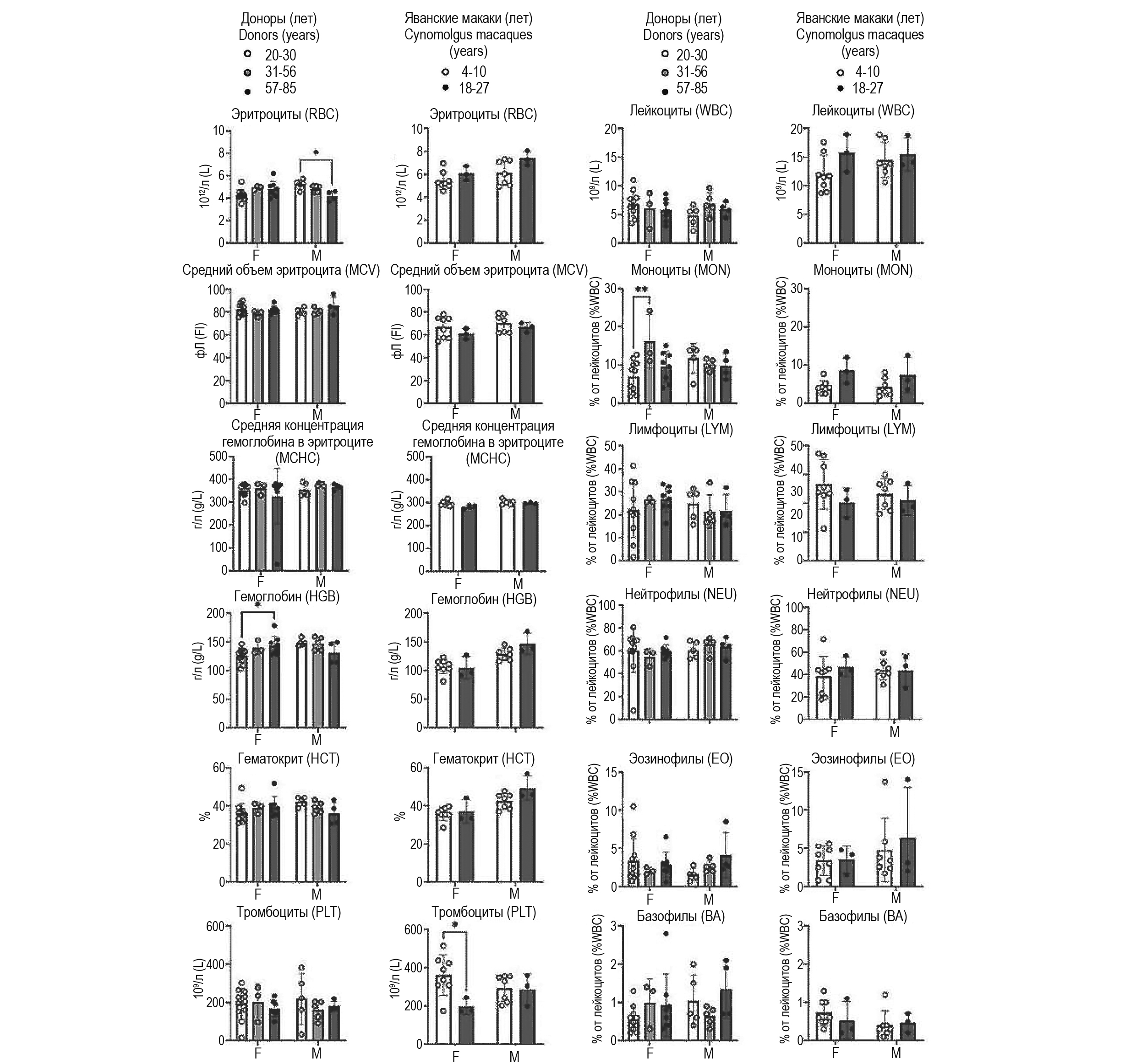 Примечание. F – женщины и самки макак соответственно, M – мужчины и самцы макак. Условно здоровые доноры: 20-30 лет (медиана – 23 года, 11 женщин, 5 мужчин), 31-56 лет (медиана – 41 год, 3 женщины, 5 мужчин), 57-85 лет (медиана – 61 год, 8 женщин, 4 мужчин); Яванские макаки: 4-9 лет (соответствует 13,2-33,3 человеческим годам, медиана – 6 лет, 7 самок, 7 самцов), 18-27 лет (соответствует 57-89 человеческим годам, 3 самки, 3 самца). Представлены средние и стандартные отклонения. * – p < 0,05, ** – p < 0,01, двухфакторный дисперсионный анализ с множественными сравнениями Сидака.