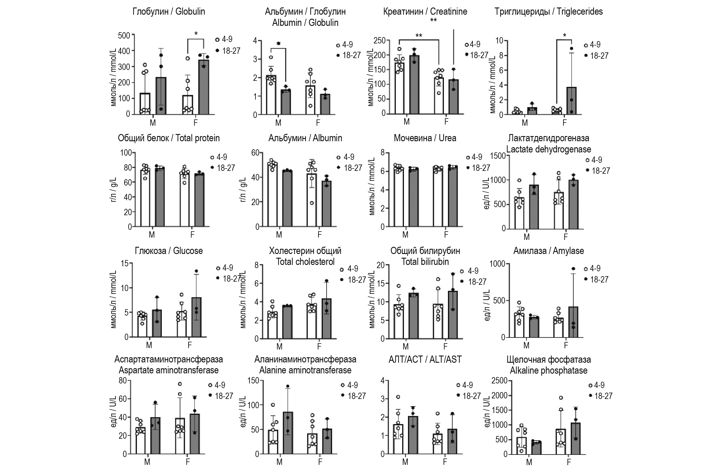 В ходе дальнейшей работы были исследованы биохимические показатели крови, сопровождающие старение яванских макак (рис. 2). Так, обнаружено достоверное повышение уровней триглицеридов и глобулина у самок макак в возрасте 18-27 лет по сравнению с группой самок 4-9 лет, такая же тенденция наблюдается у самцов. У самцов в возрасте 18-27 лет соотношение общего альбумина/глобулина значительно ниже чем у самцов 4-9 лет, снижение этого показателя у самок наблюдали на уровне тенденции (рис. 2). Сравнение биохимических показателей выявило достоверные половые отличия в уровнях креатинина у самцов и самок разных возрастных групп. Так, уровень креатинина у самцов яванских макак во всех возрастных группах было достоверно выше, чем у самок в тех же возрастных группах. Других достоверных различий в биохимических показателях крови не выявлено. В то же время у самцов и самок прослеживается тенденция к повышению глюкозы, билирубина, холестерина и воспалительных ферментов с возрастом.