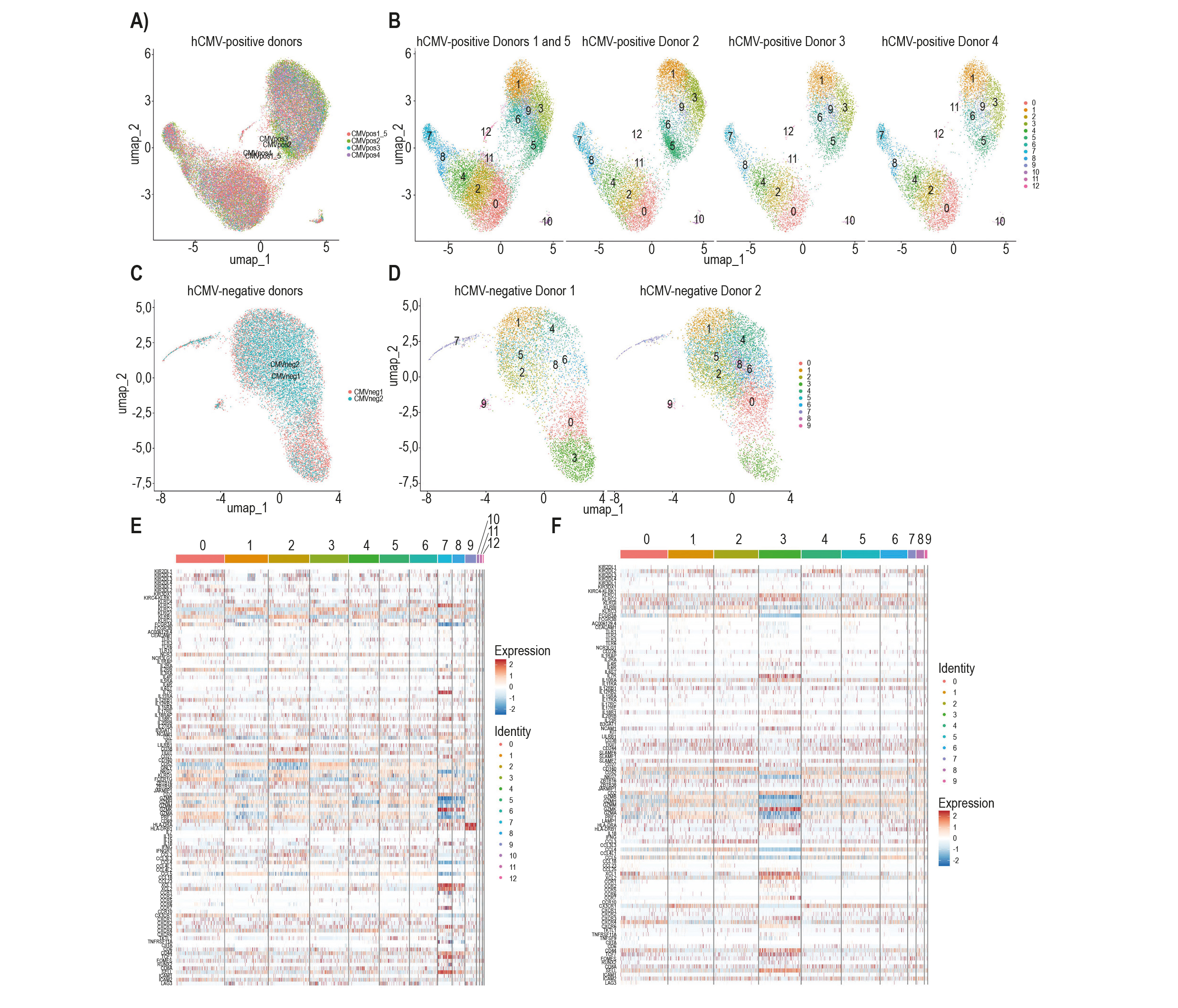 2. Figure 1. Single-cell RNA sequencing analysis of 5 hCMV-seropositive and 2 hCMV-seronegative donors from [6]. Note. A, UMAP projection of NK cells from 5 hCMV-seropositive donors showing donor-specific groupings. B, UMAP projection of NK cells from 2 hCMV-seronegative donors displaying clusters for each donor in the integrated dataset. C, UMAP projection of NK cells from 2 hCMV-seronegative donors illustrating donor groupings. D, UMAP projection of NK cells from 5 hCMV-seropositive donors showing clusters for each donor in the integrated dataset. Heatmaps depict normalized expression values of NK cell-associated genes that were differentially expressed in at least one cluster for (E) 5 hCMV-seropositive donors and (F) 2 hCMV-seronegative donors.